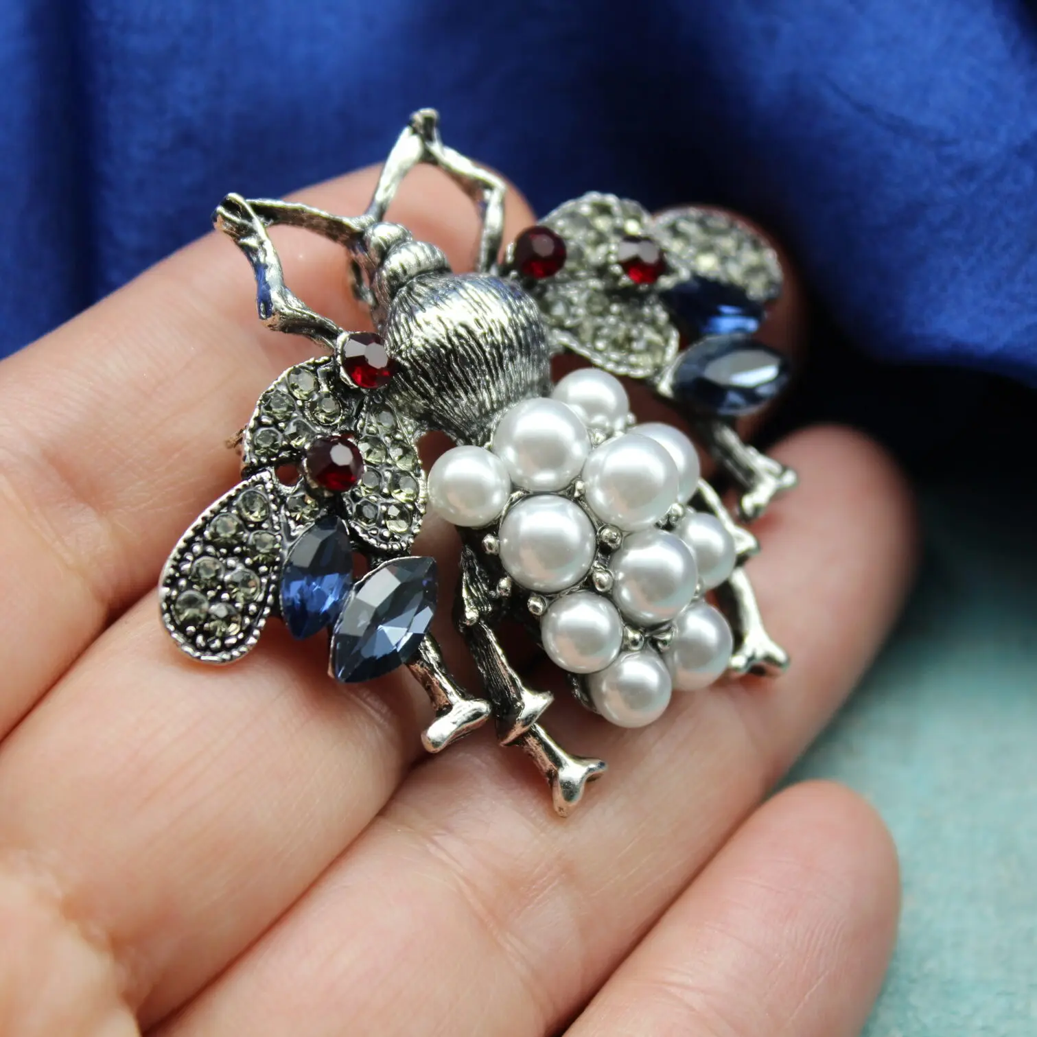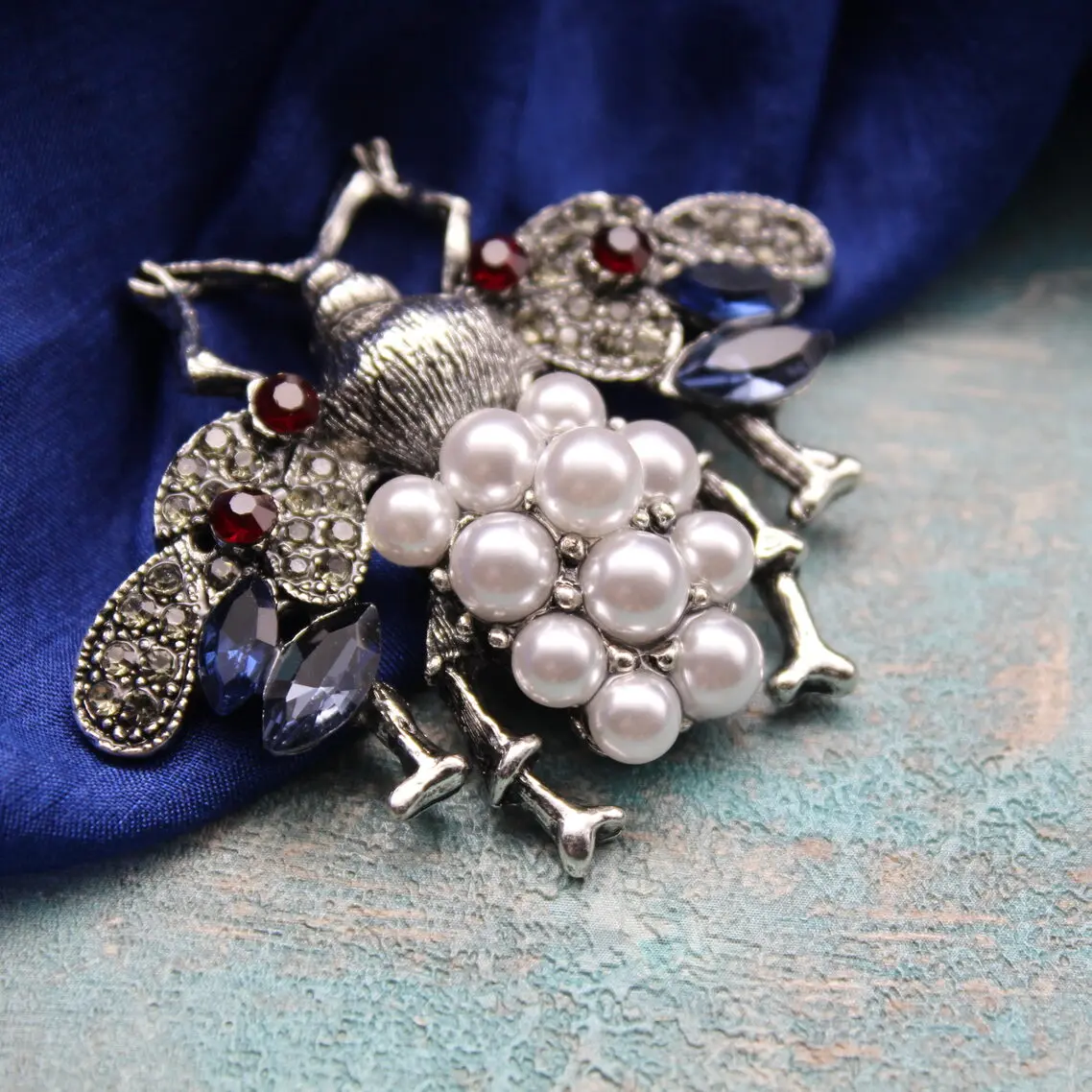 Брошь-подвеска в виде жука из серебристого металла, искусственного жемчуга, кристаллов.