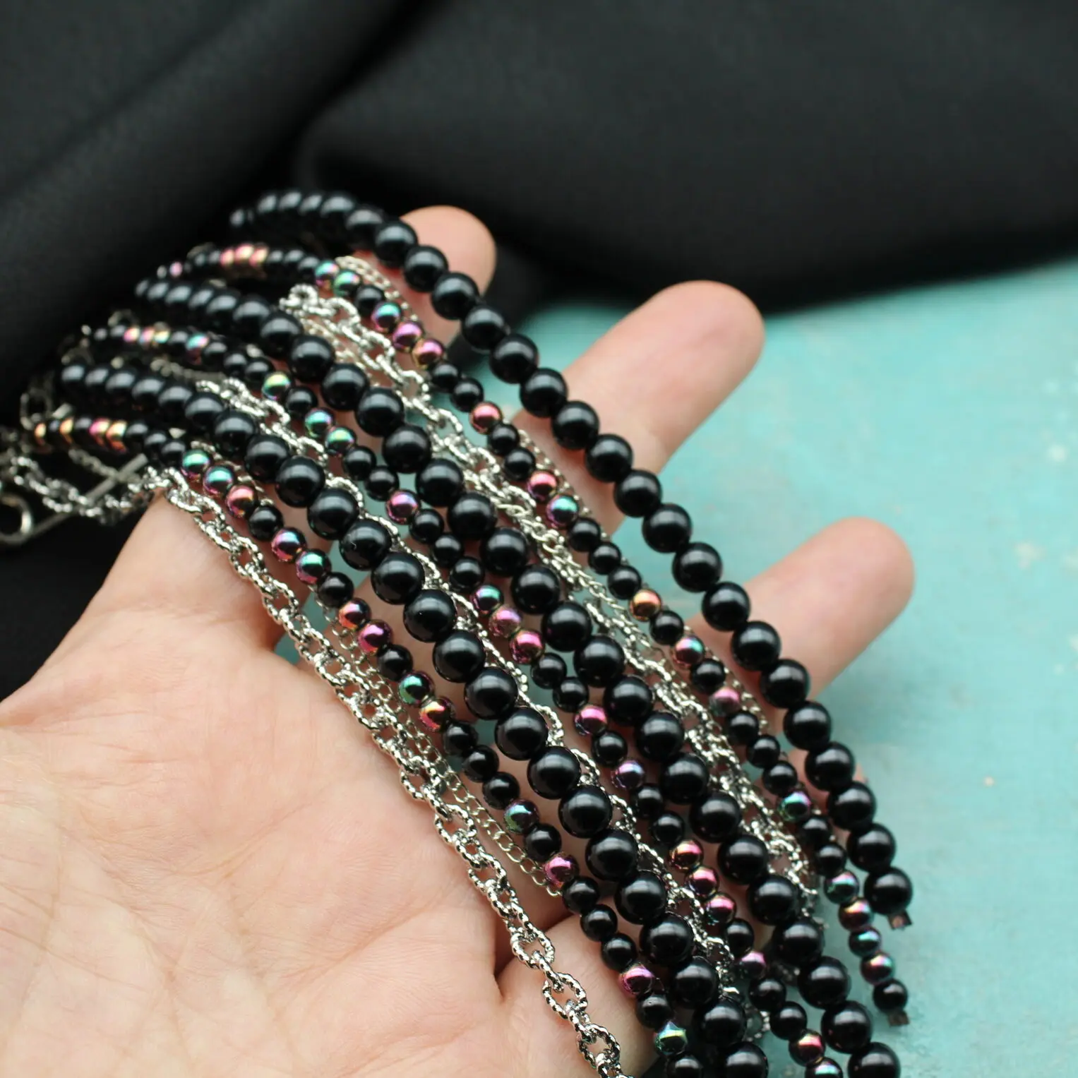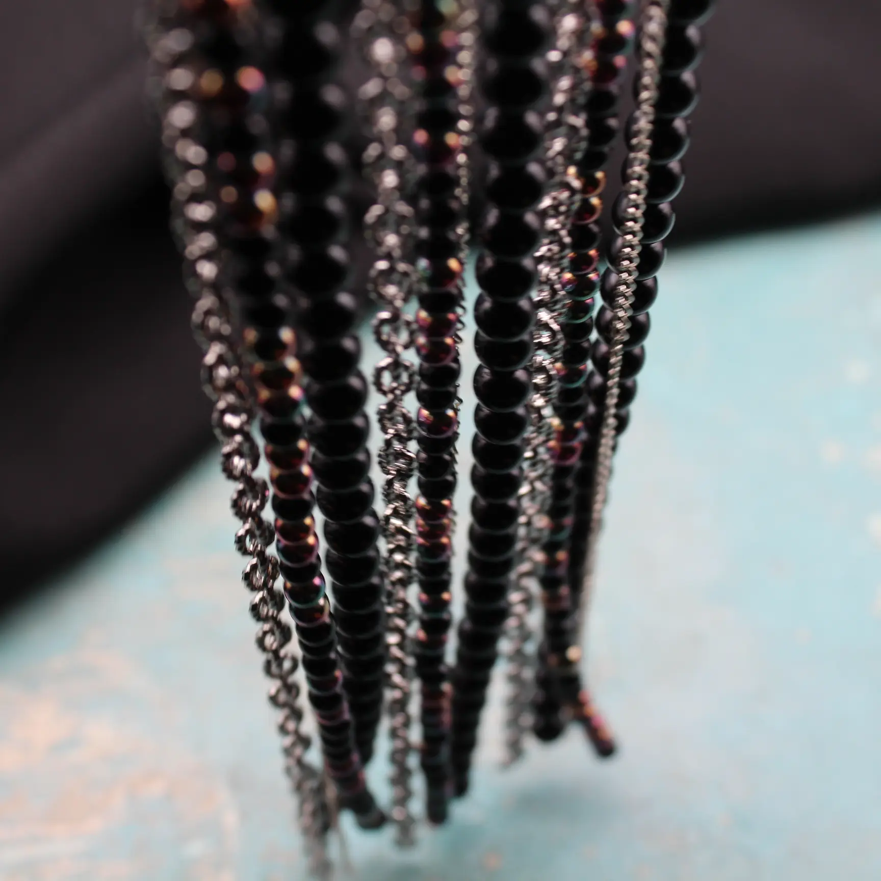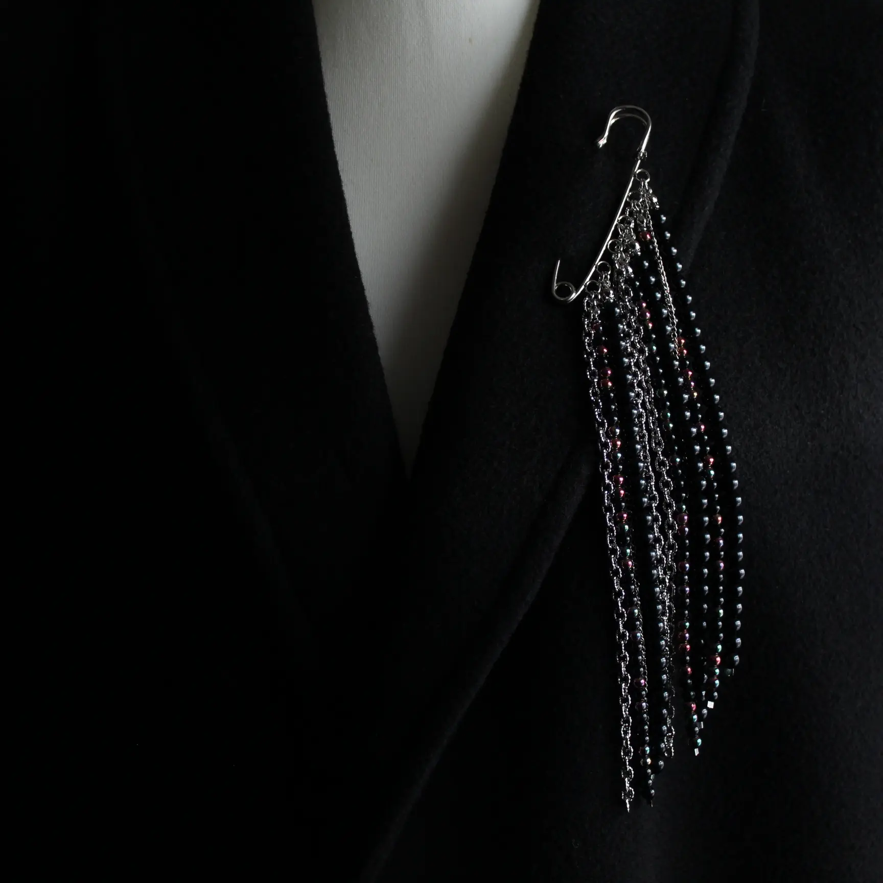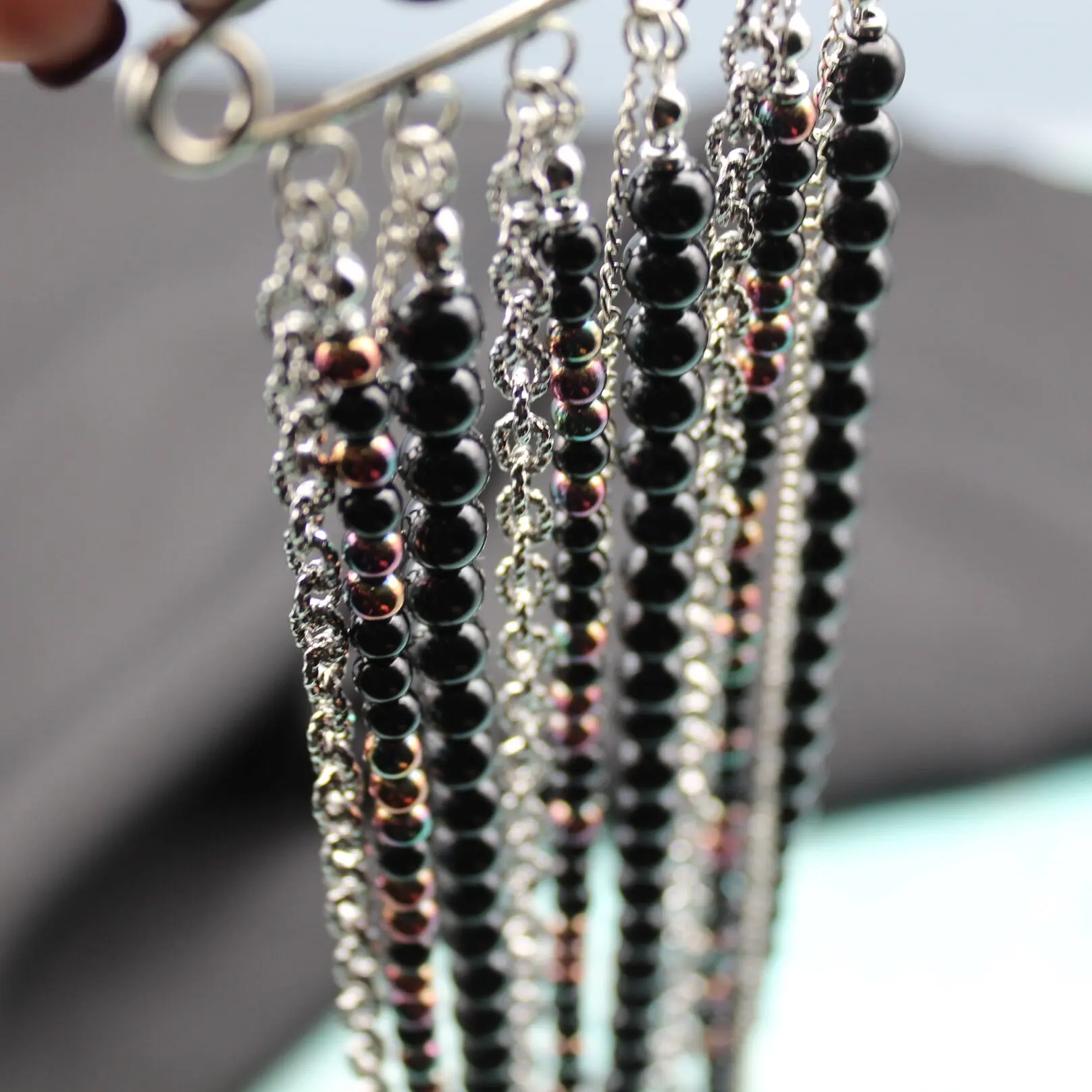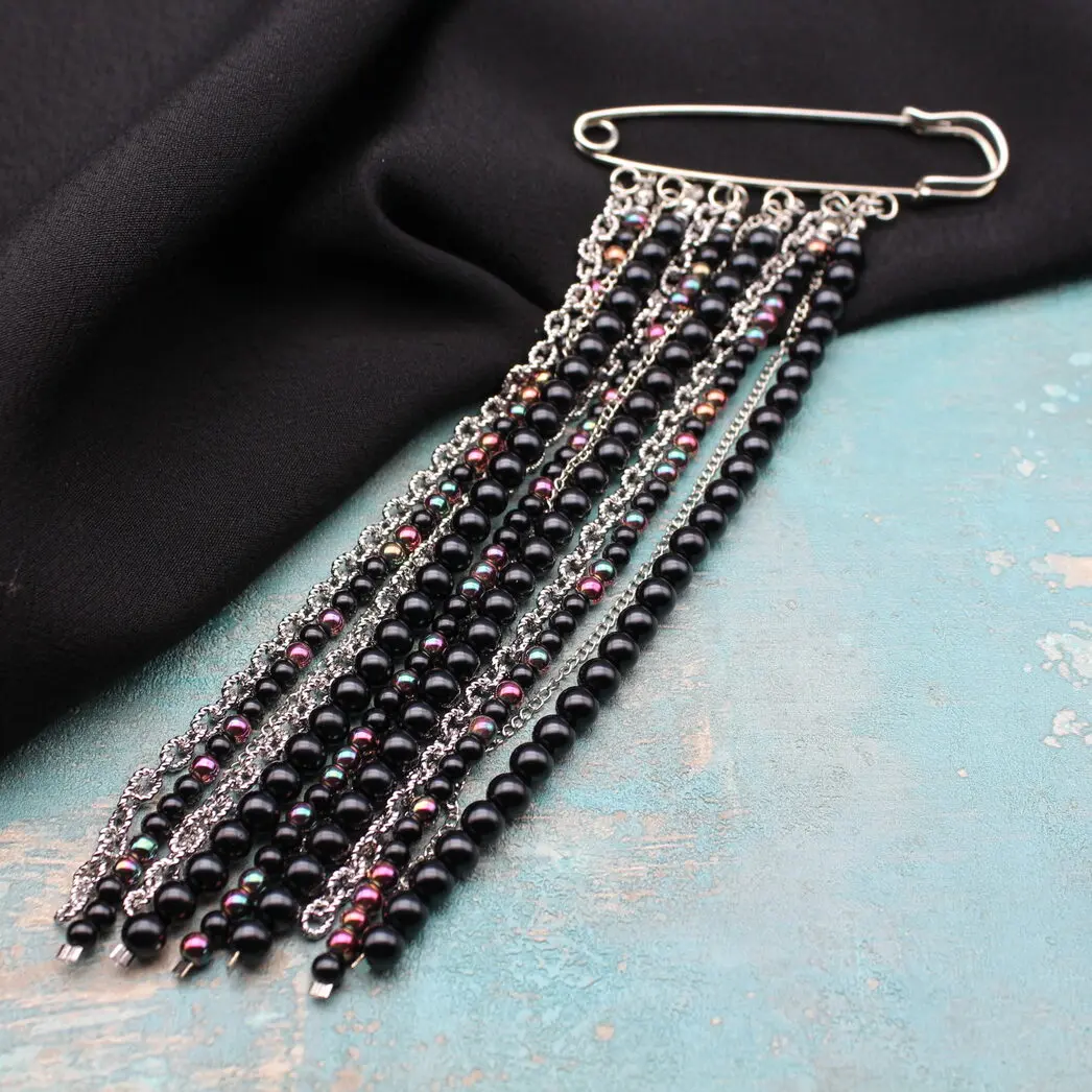 Брошь булавка из серебристого сплава, разноцветного гематита, черного агата, цепей.