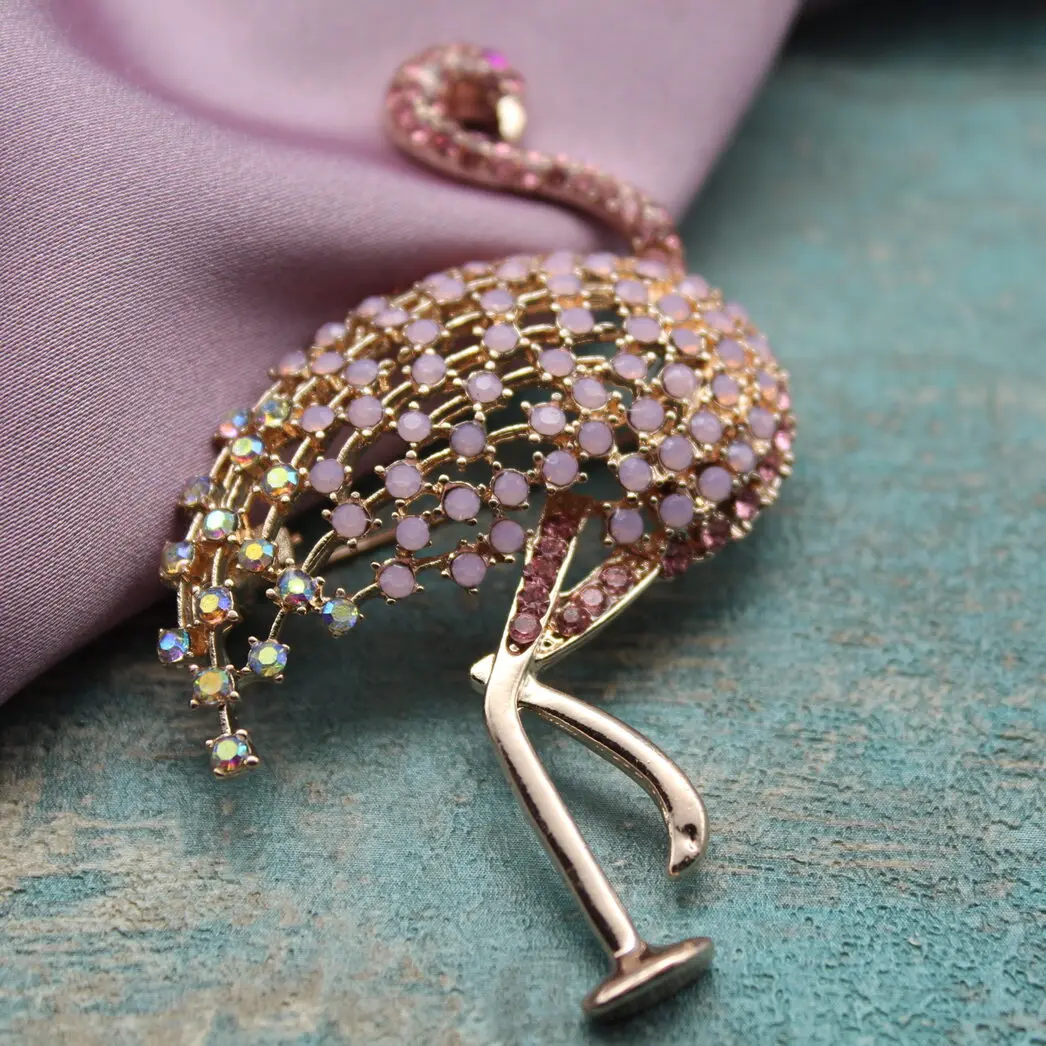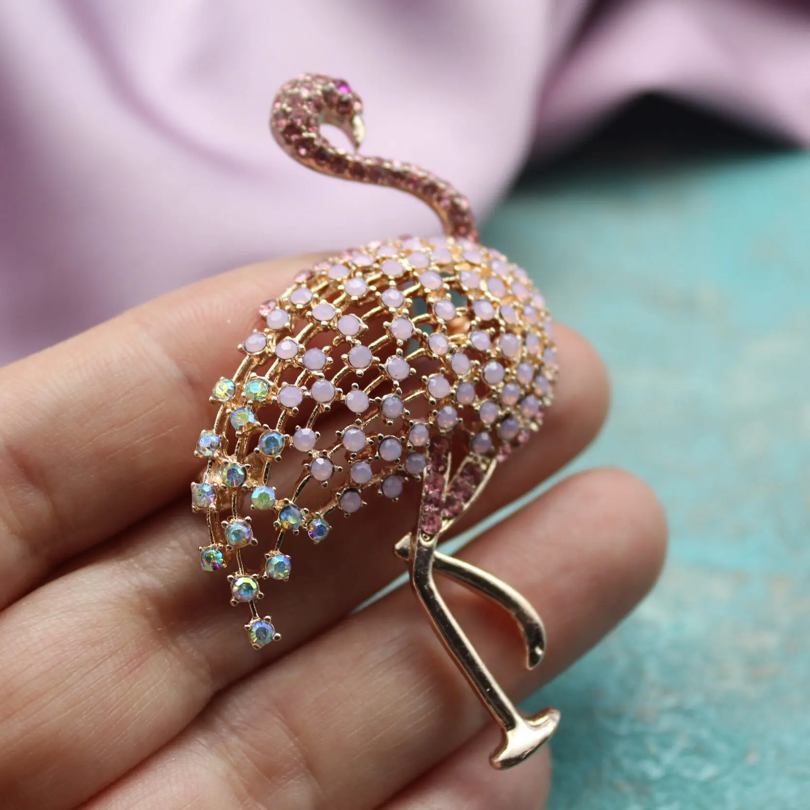Брошь в виде фламинго из разнообразных страз, сплава цвета "розового золота".