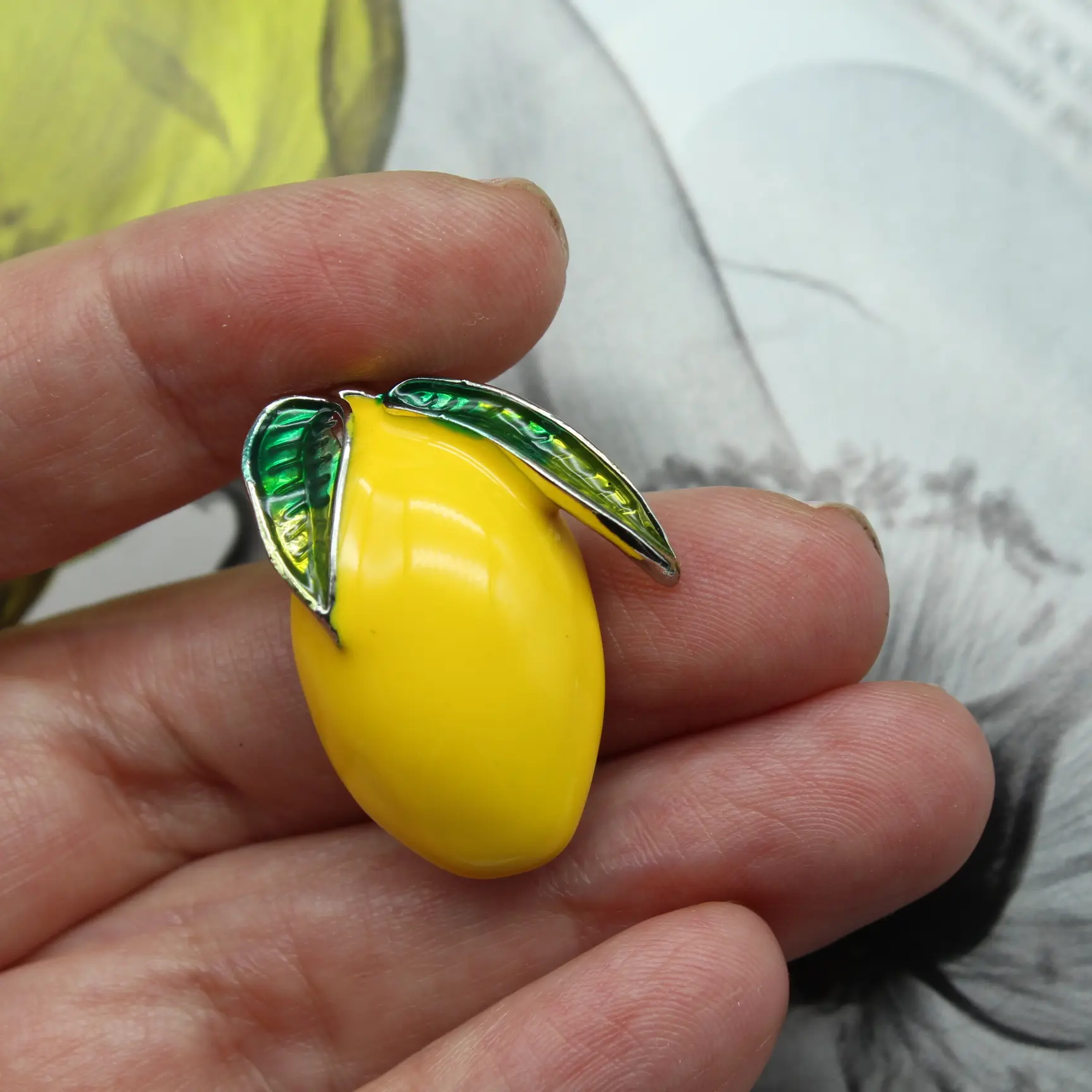 Брошь в виде лимончика из золотистого металлического сплава, желтой и зеленой эмали.