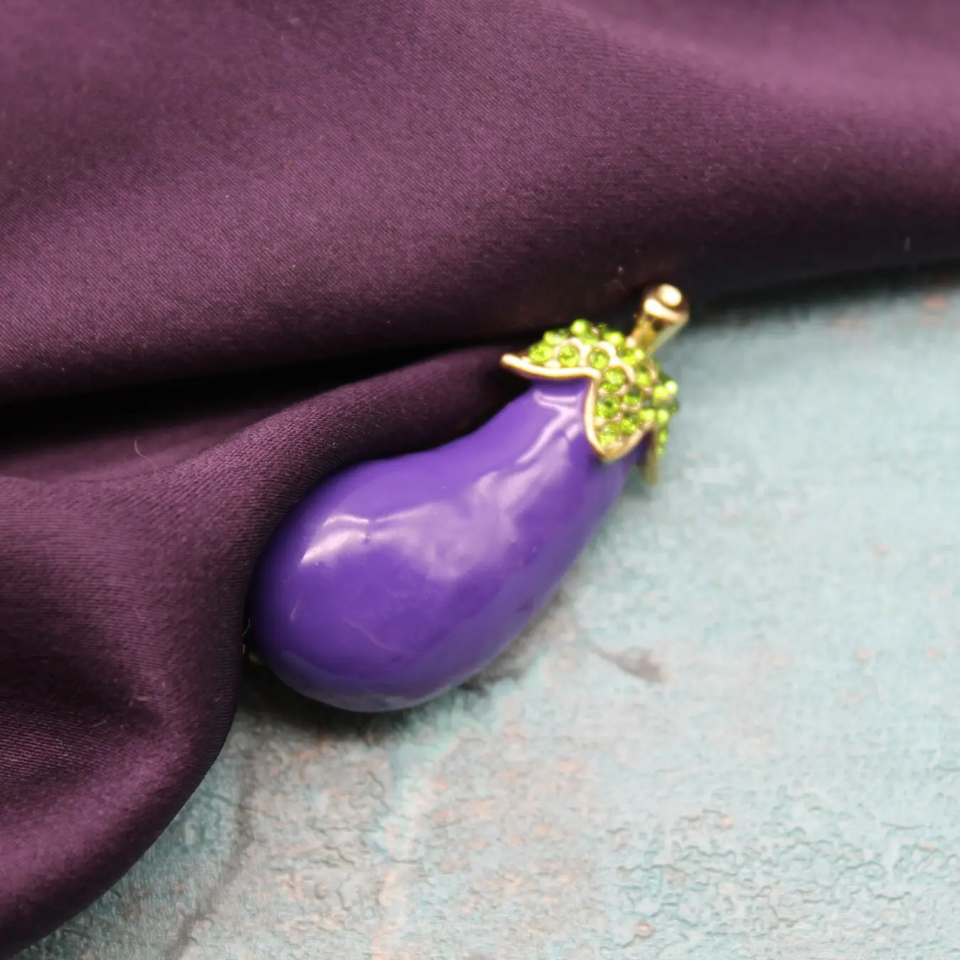 Брошь в виде симпатичного баклажанчика из золотистого металлического сплава, зеленой эмали, зеленых страз.