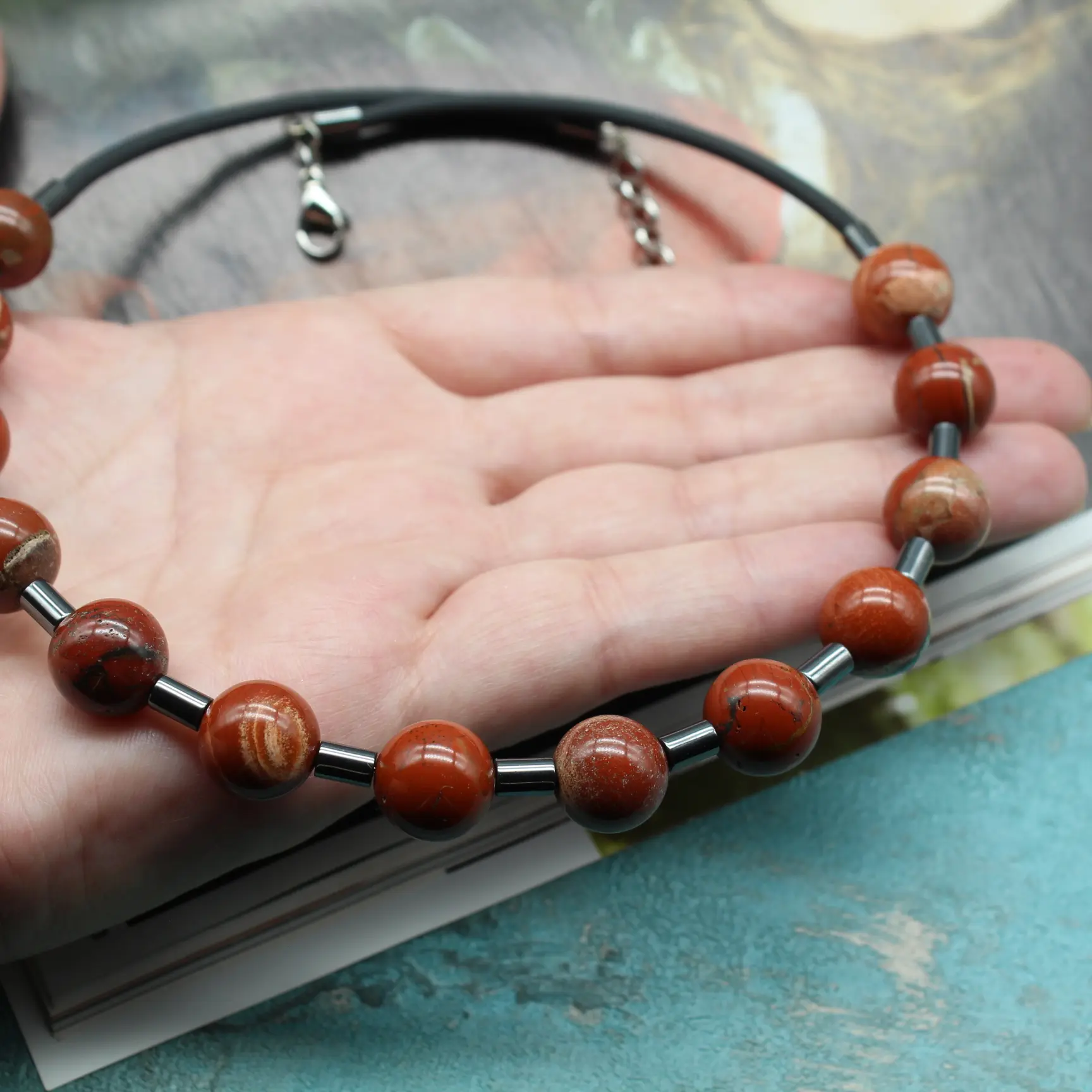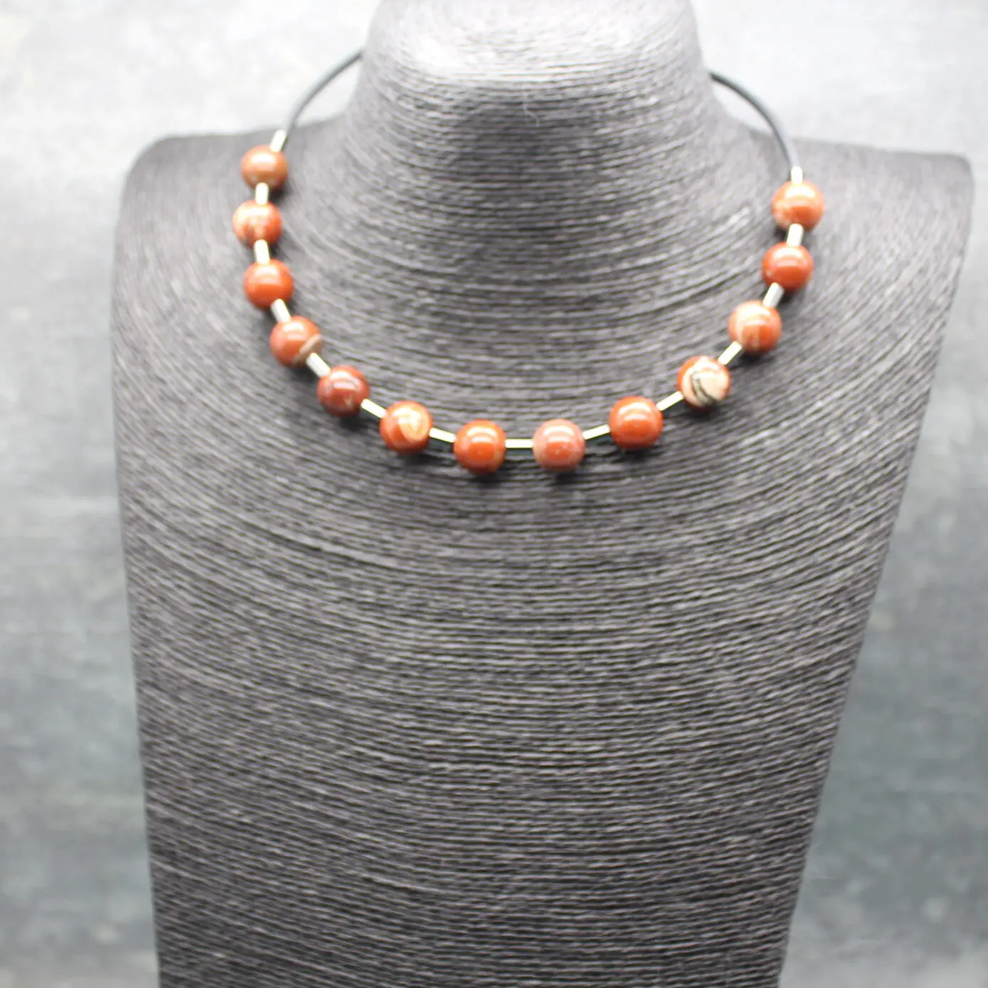 Ожерелье из красной яшмы, каучука, посеребренной черненной фурнитуры.