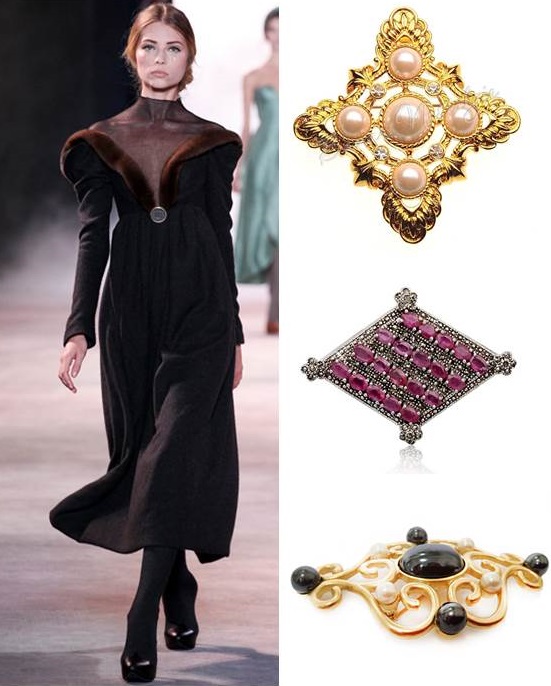 В современной моде такими украшениями рекомендуется закалывать палантины, парео, накидки, воротники-хомуты.
