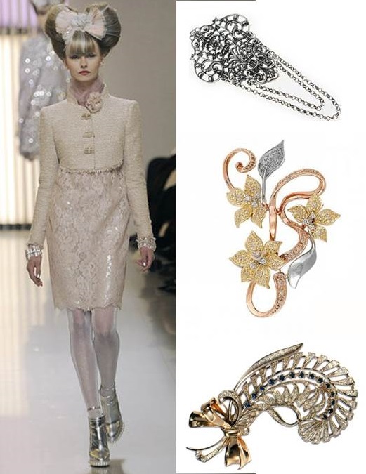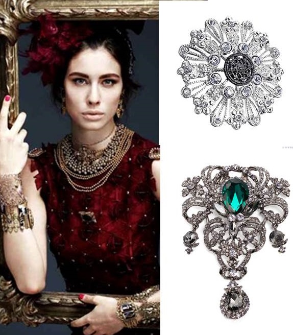 Во времена Барокко и Рококо броши выглядели очень богато и помпезно. Крупные, объемные, они обильно украшались брильянтами и другими драгоценными камнями. Часто красавицы злоупотребляли – одевали по нескольку брошей одновременно. Такие броши в тренде и сегодня, но стоит обратить внимание – эти броши для торжественного случая, отлично сочетаются с парчой, бархатом, атласом. Броши эпохи Рококо – это изящные, элегантные цветочные букетики или гирлянды из драгоценных камней. Такие броши хороши и уместны с легкими платьями, блузками и костюмами.