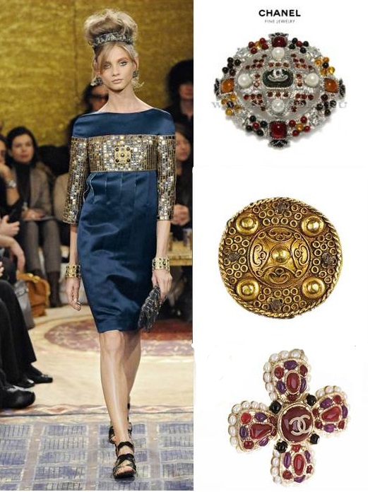 Наиболее сильное влияние на эволюцию брошей оказала Византия и византийская культура. Брошь стала не только функциональной необходимостью, но и декларировала статус человека. Броши симметричной формы часто являлись дополнением к церковной одежде, украшались драгоценными камнями – жемчугом, рубинами, изумрудами, эмалью, символами. Византийские броши отличались тонкой ювелирной работой. Современная мода предполагает использовать такой аксессуар, как центр композиции костюма. Он идеально смотрится на однотонных блузках, платьях.