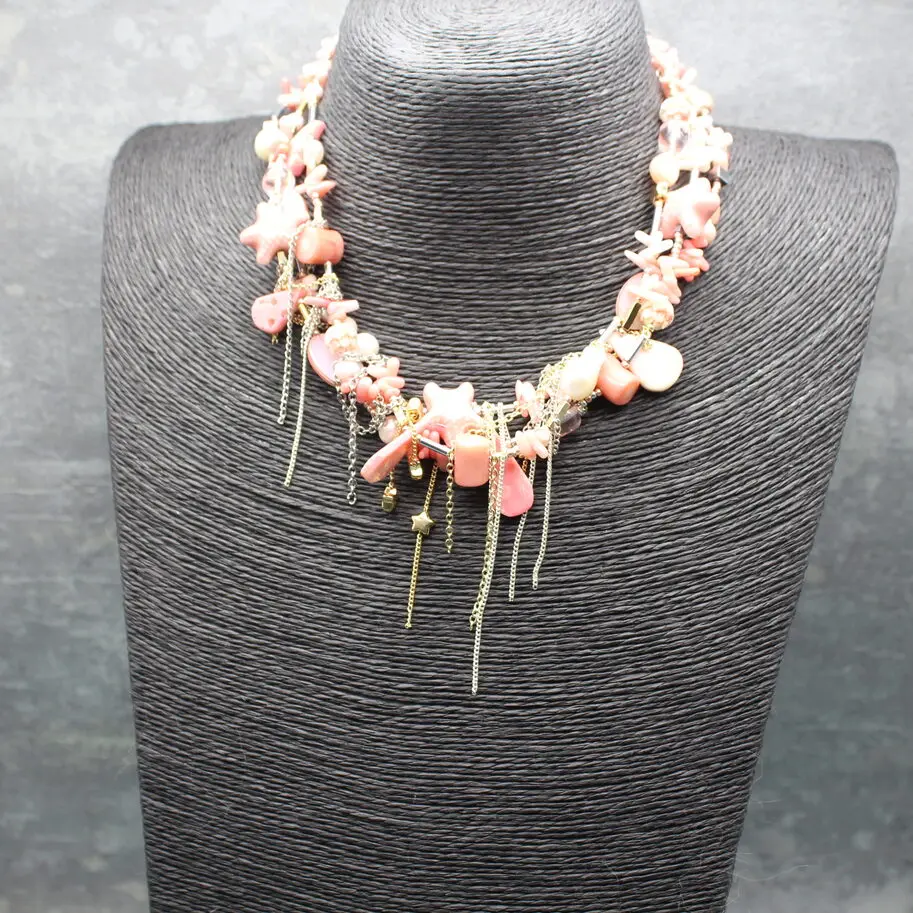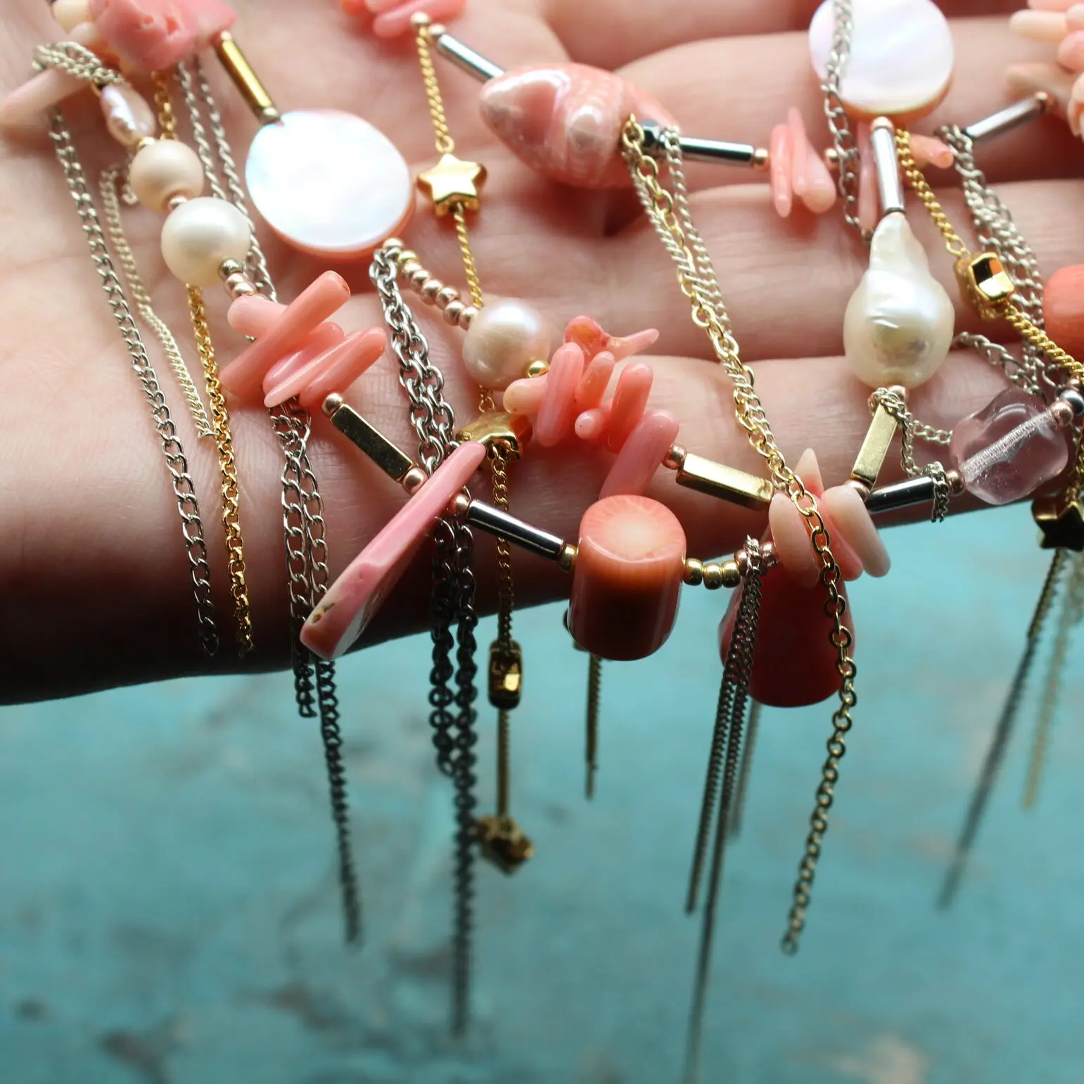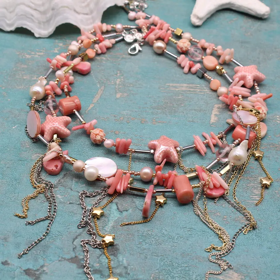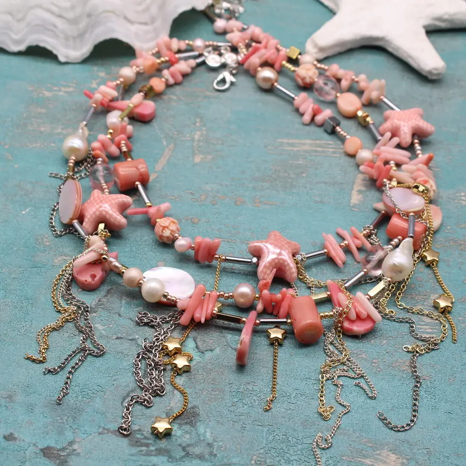 Яркое, эффектное украшение из натурального коралла, перламутра, барочного жемчуга в актуальных трендах - с цепочками и разнообразными элементами в виде морских звездочек, цветов!