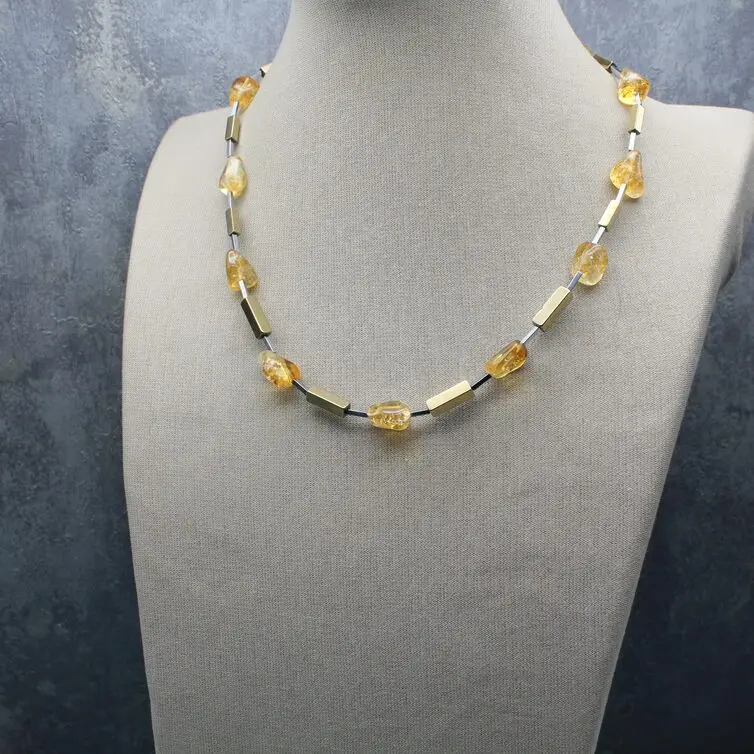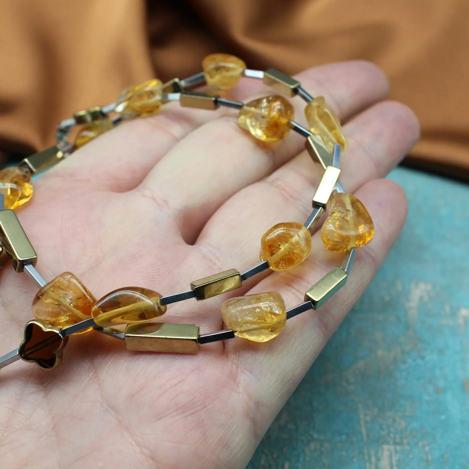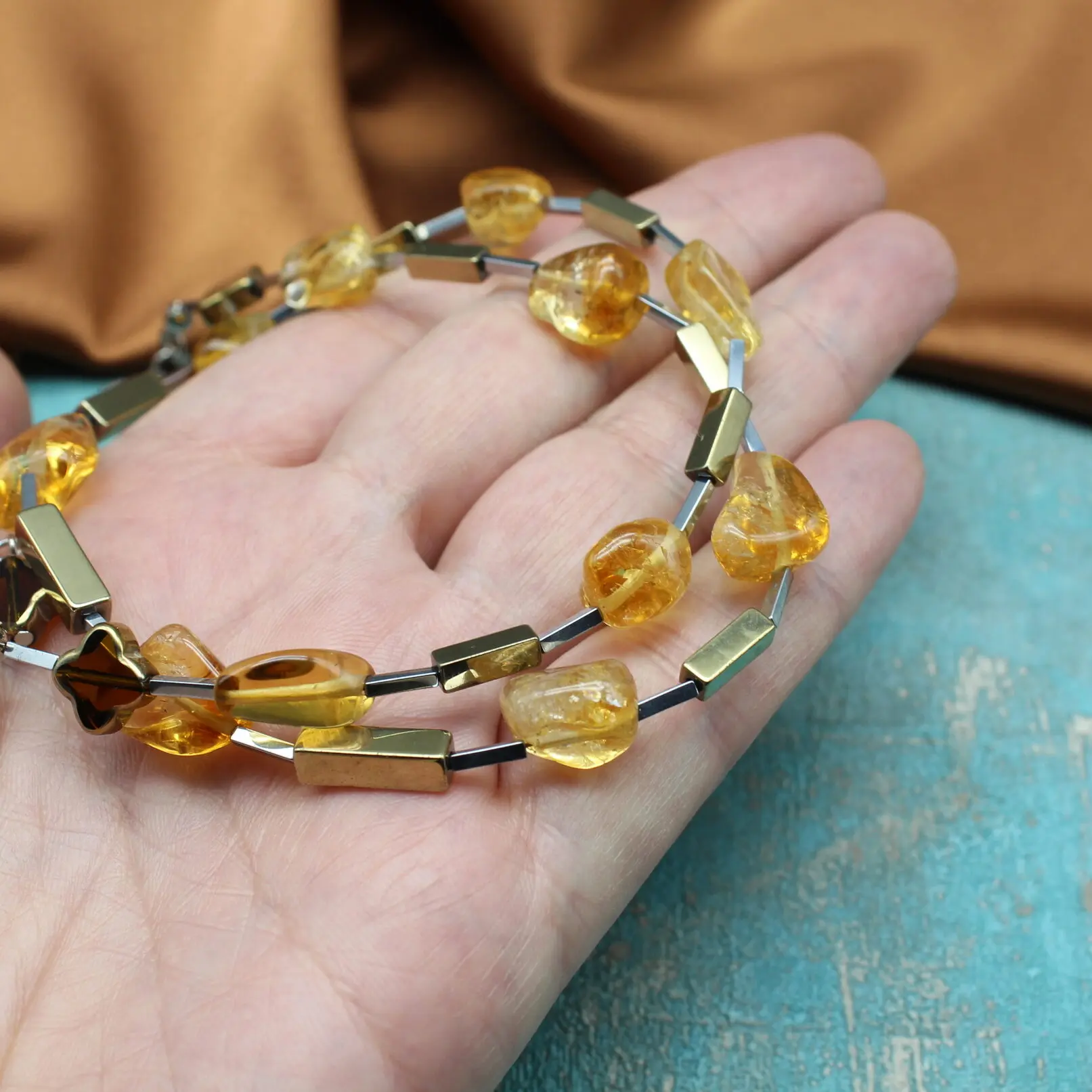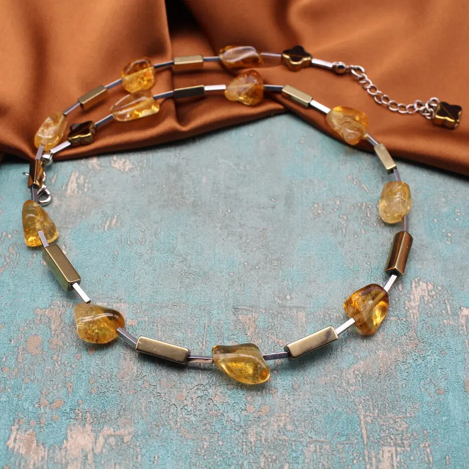 Колье из натурального цитрина, гематита, богемского стекла, посеребренной фурнитуры.