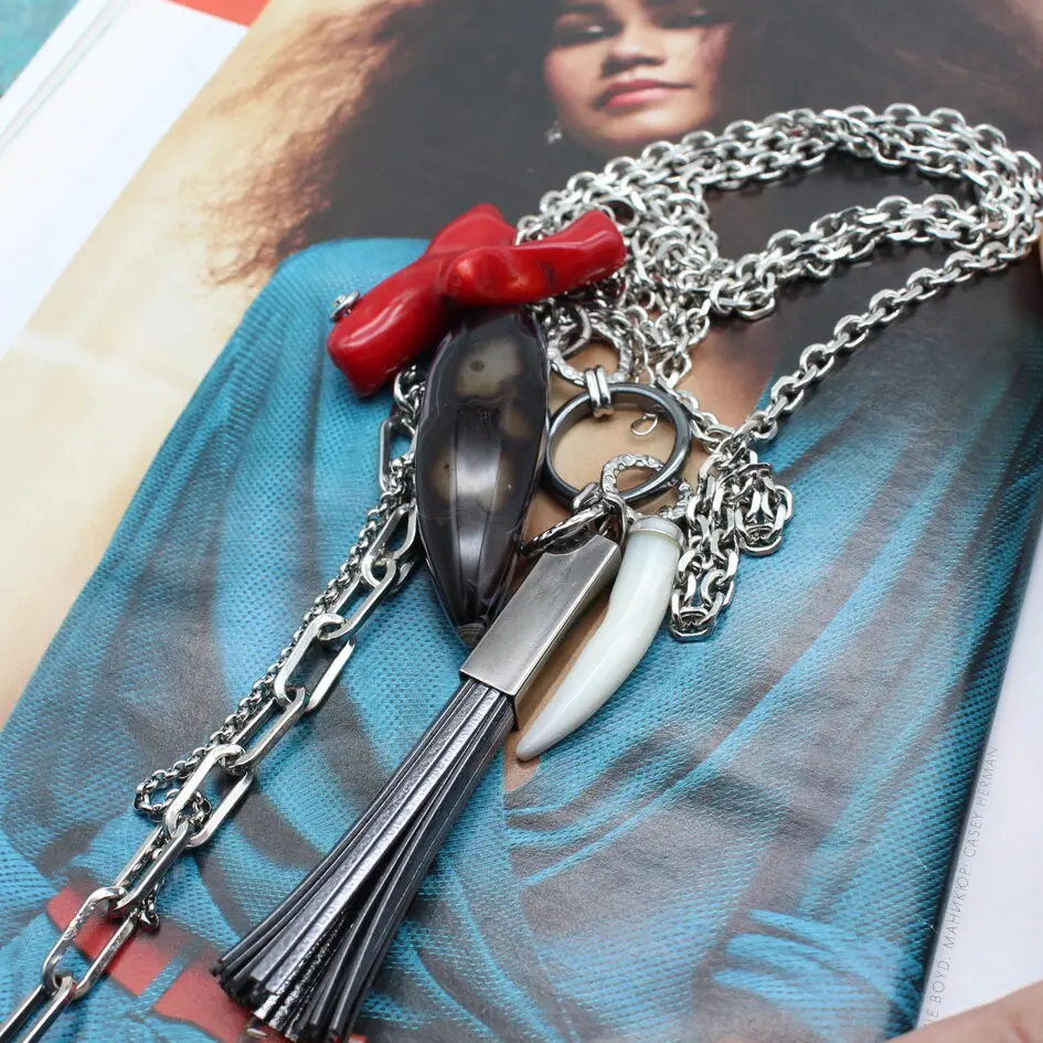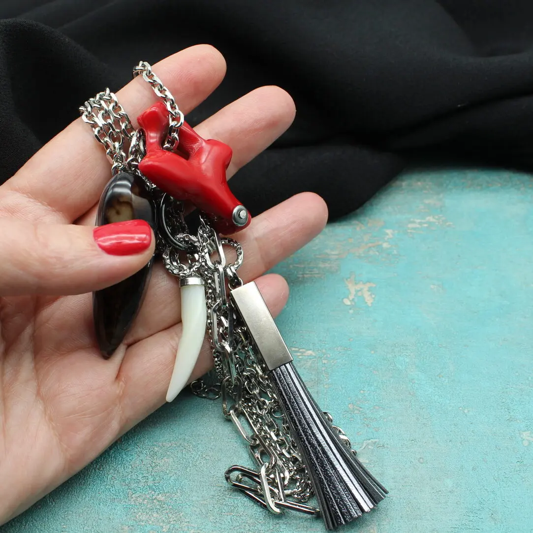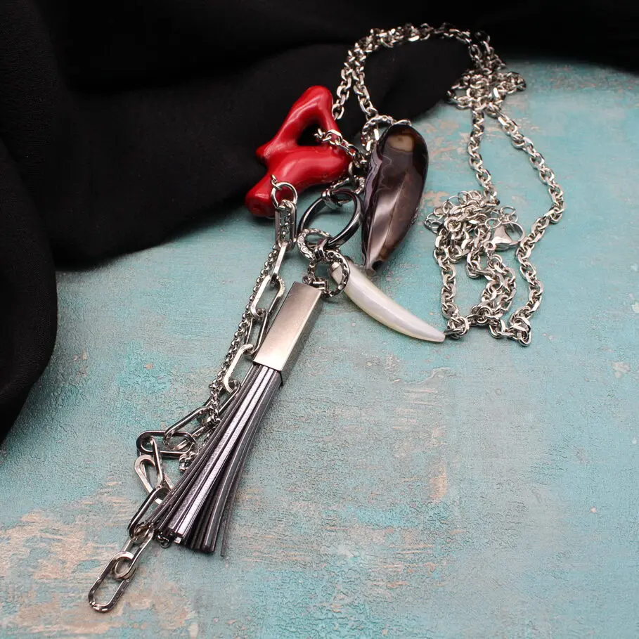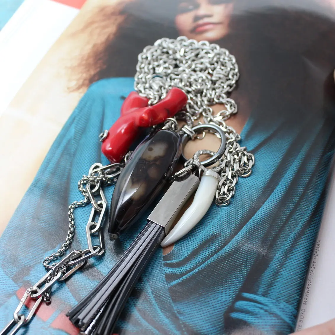 Колье из фрагмента натурального коралла, агата, перламутра, роскошной кисти из серебристой кожи, цепи.
