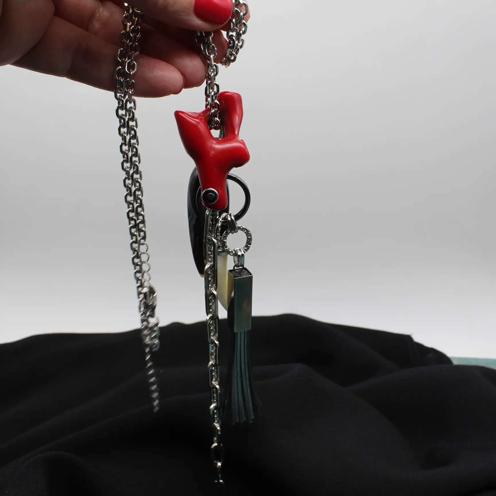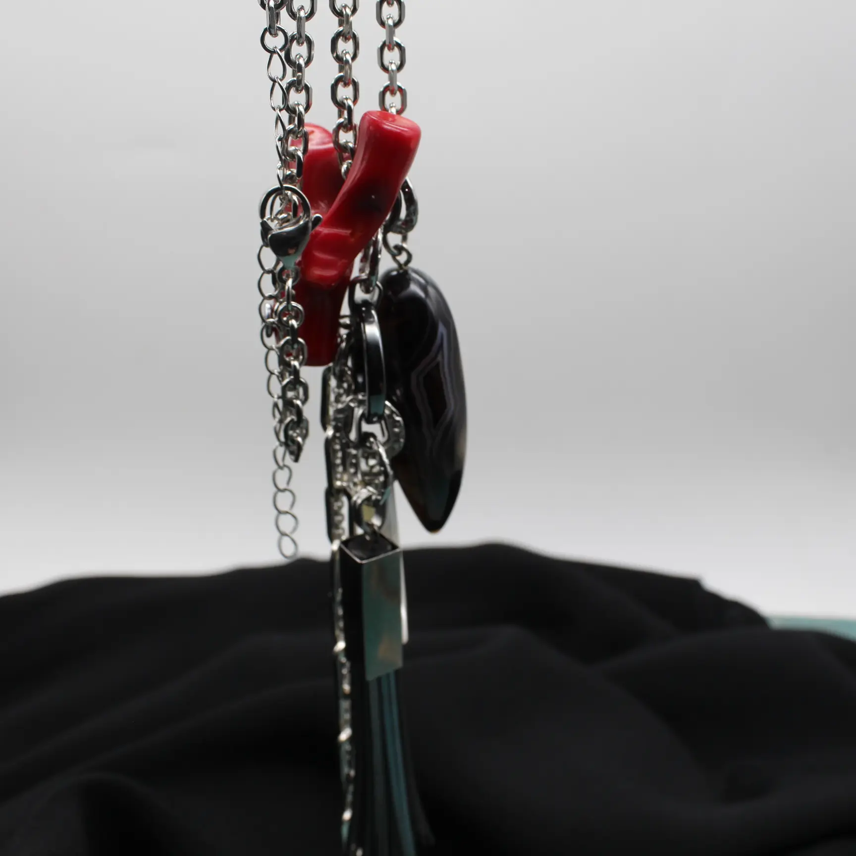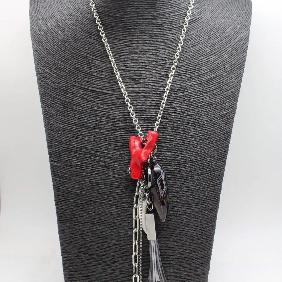 Колье из фрагмента натурального коралла, агата, перламутра, роскошной кисти из серебристой кожи, цепи.