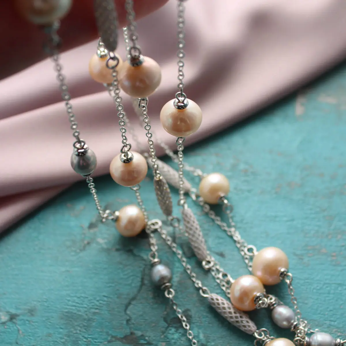 Длинное колье-сотуар из крупного сливочно-розового, серого жемчуга, посеребренной фурнитуры.