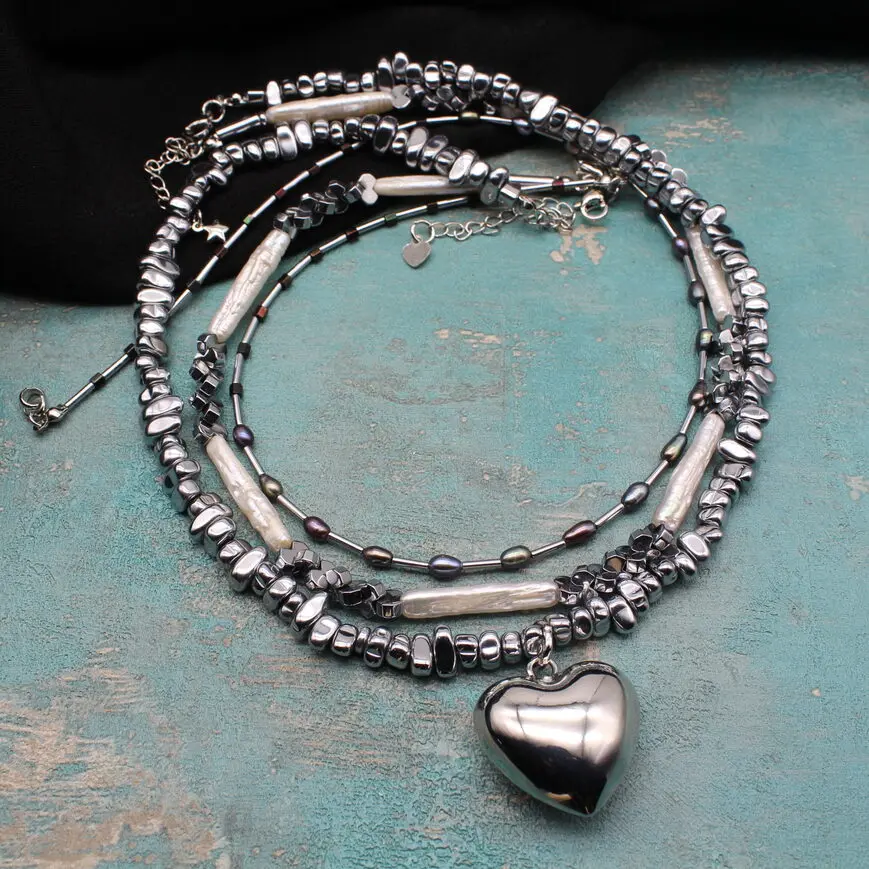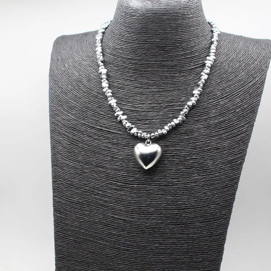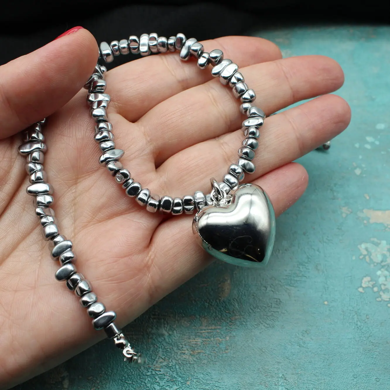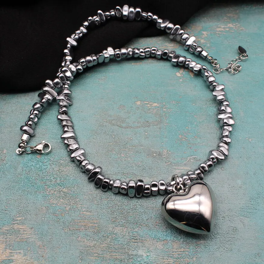Колье из гематита, подвеска из посеребренного металла с родиевым покрытием.
