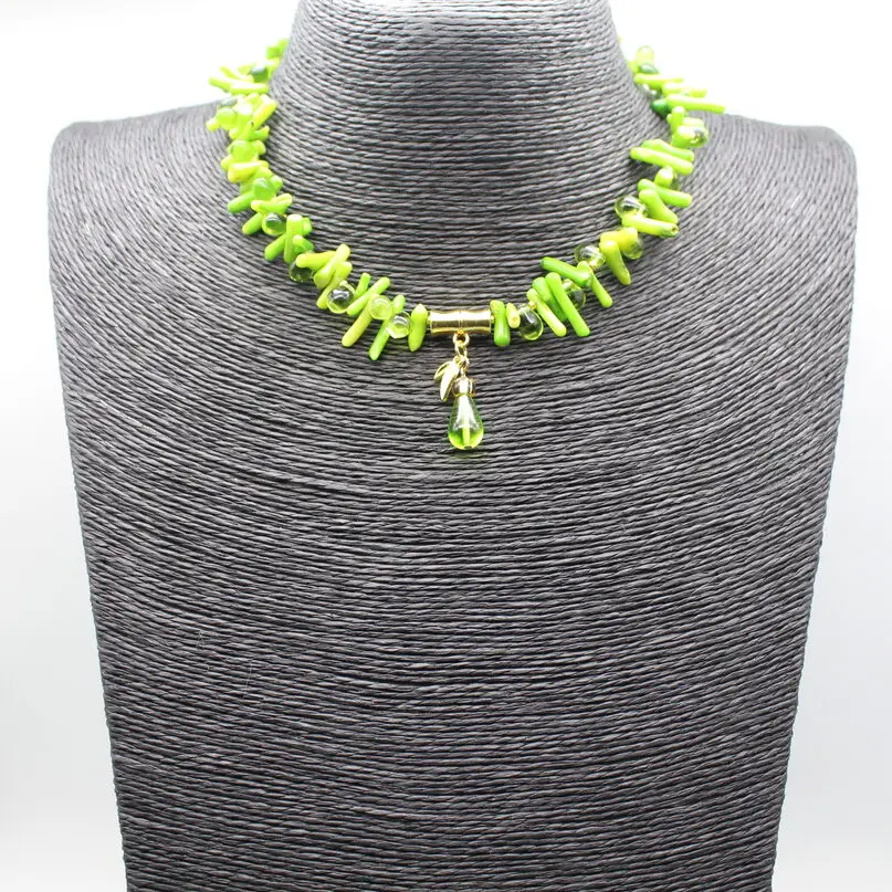 Ожерелье из натурального коралла, тонированного в красивый зеленый оттенок, богемского стекла, позолоченной 24К латунной фурнитуры.