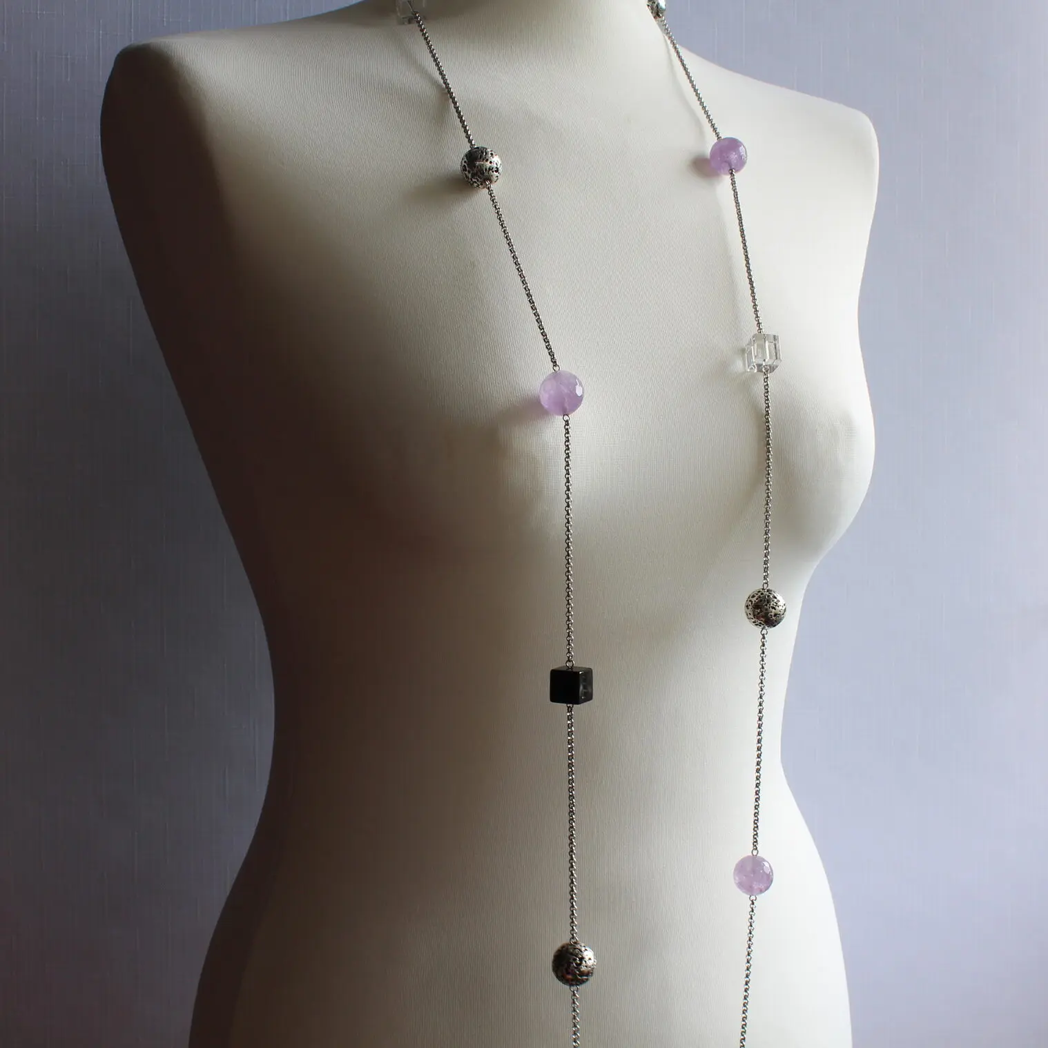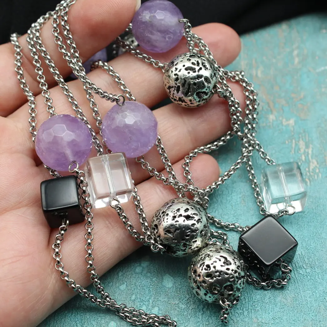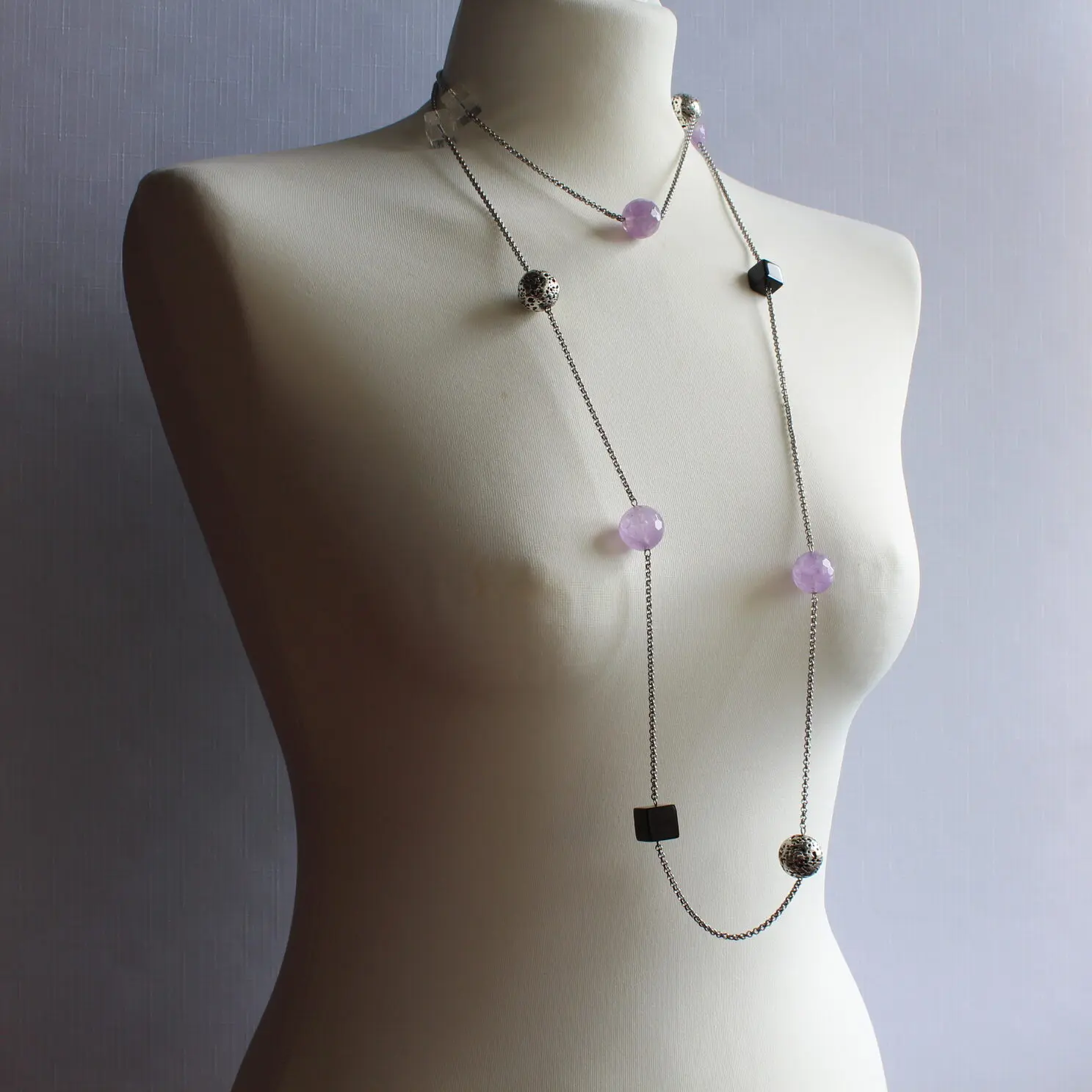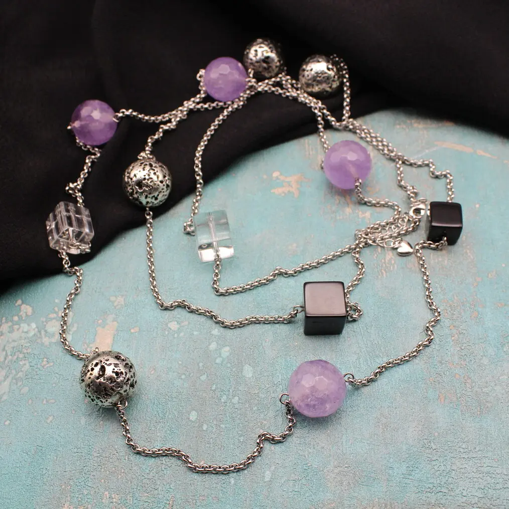 Колье из крупного натурального аметиста, черного агата, хрусталя, лавы, цепочка "роло" с родиевым покрытием.