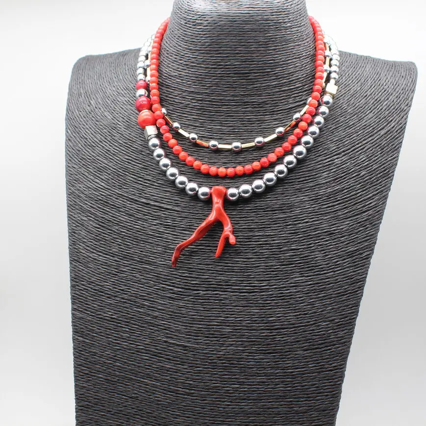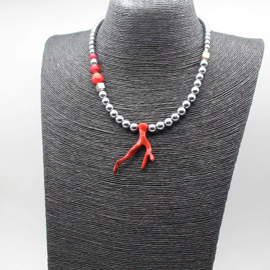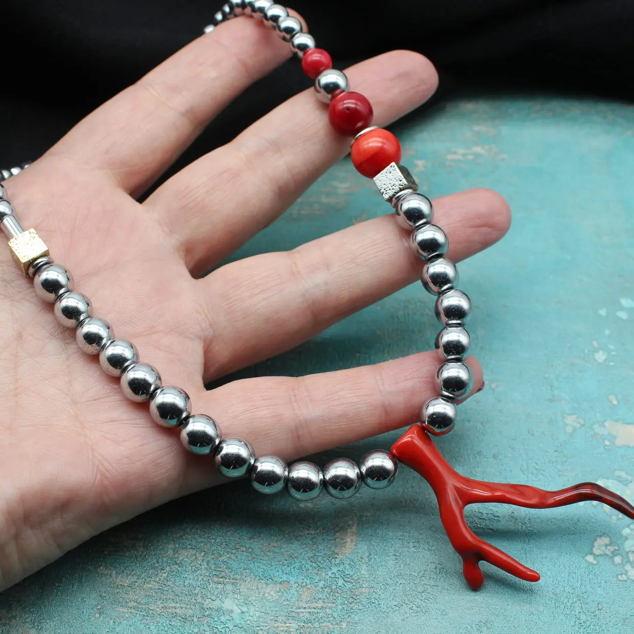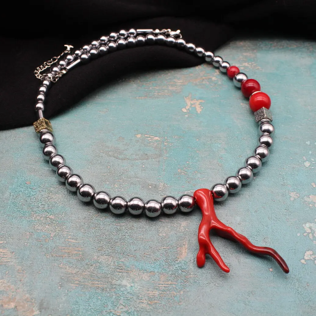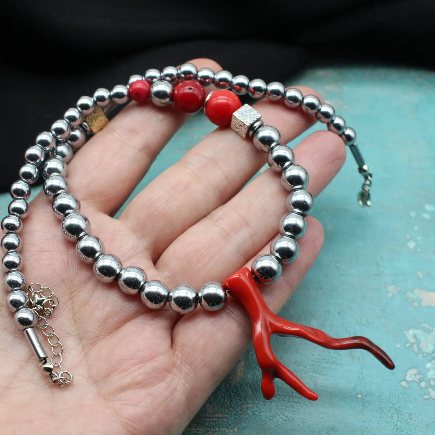 Колье из натуральных кораллов, гематита, позолоченной и посеребренной лавы, веточки коралла из пластики.