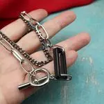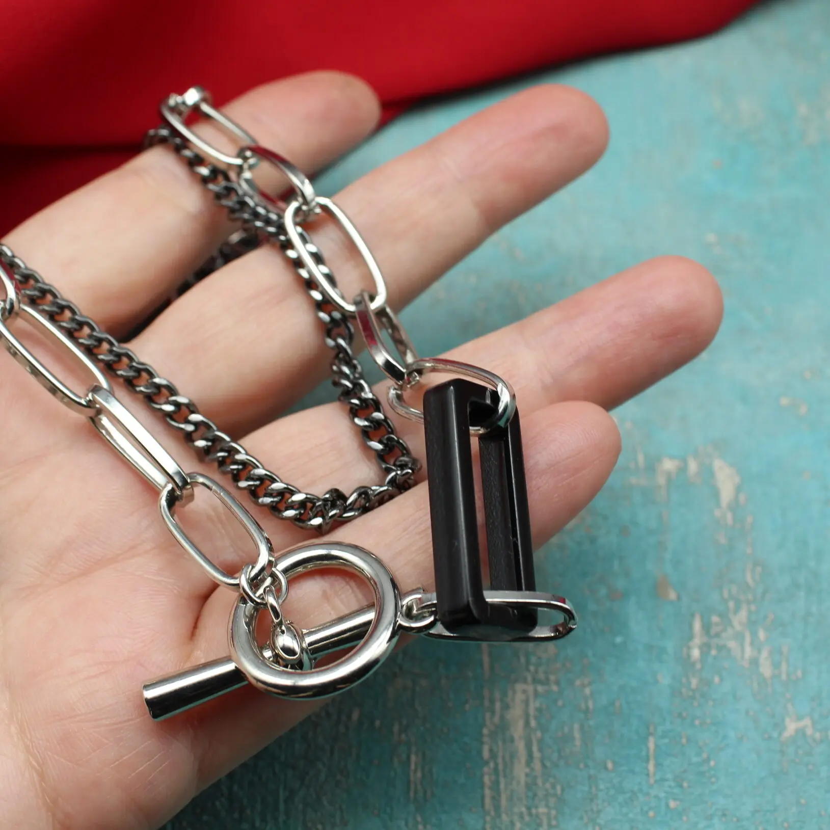 Колье состоит из двух видов цепочек с декоративными асимметричными деталями.