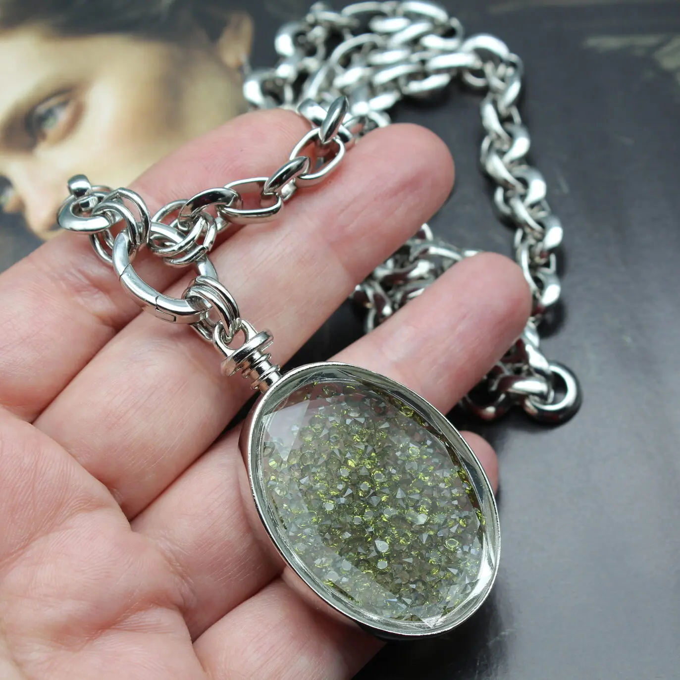 Колье из стильной цепи необычного дизайна посеребренной с родированным покрытием (р-ка Корея) и крупной подвески из граненого стекла и кристаллов.
