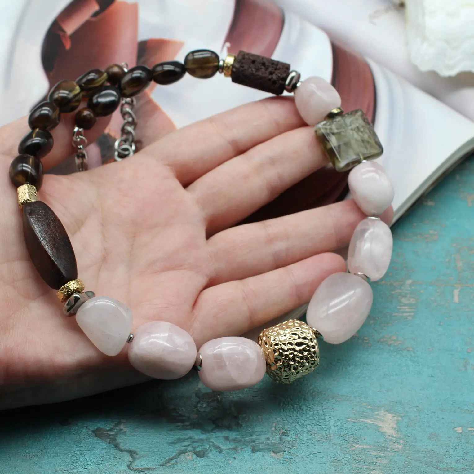 Ожерелье из крупного розового кварца, дымчатого кварца, дерева, лавы, стекла ручной работы, позолоченной фурнитуры с родиевым покрытием.