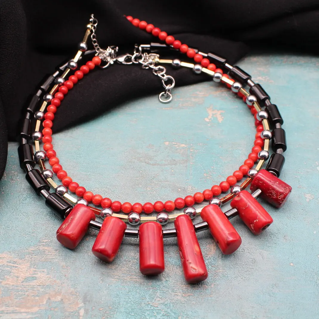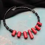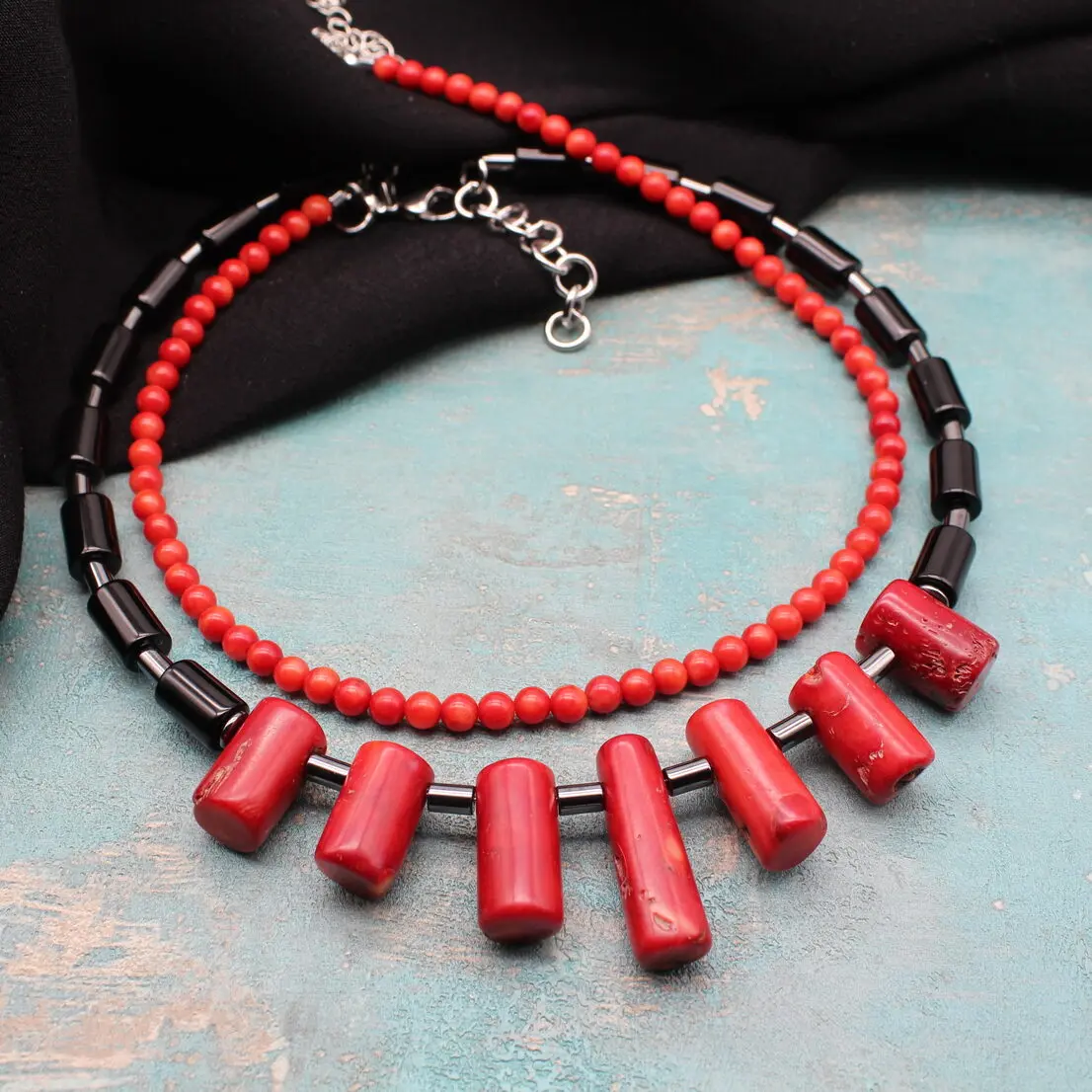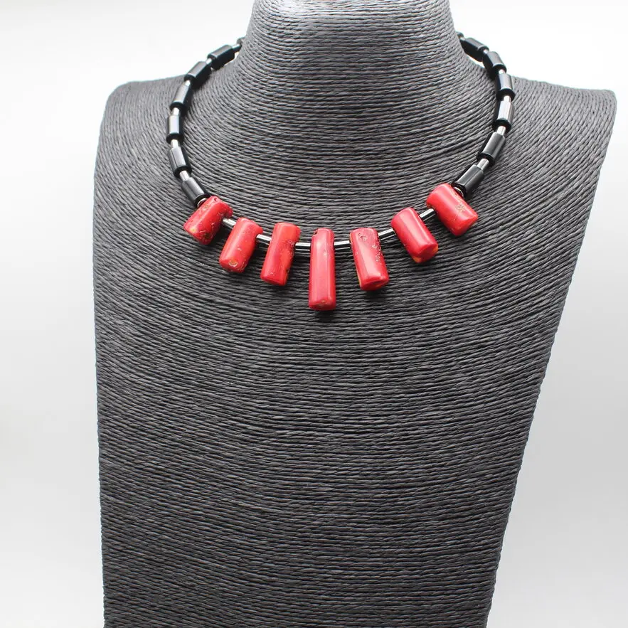 Ожерелье-чокер из натурального крупного коралла, гематита, черного агата, посеребренной фурнитуры.