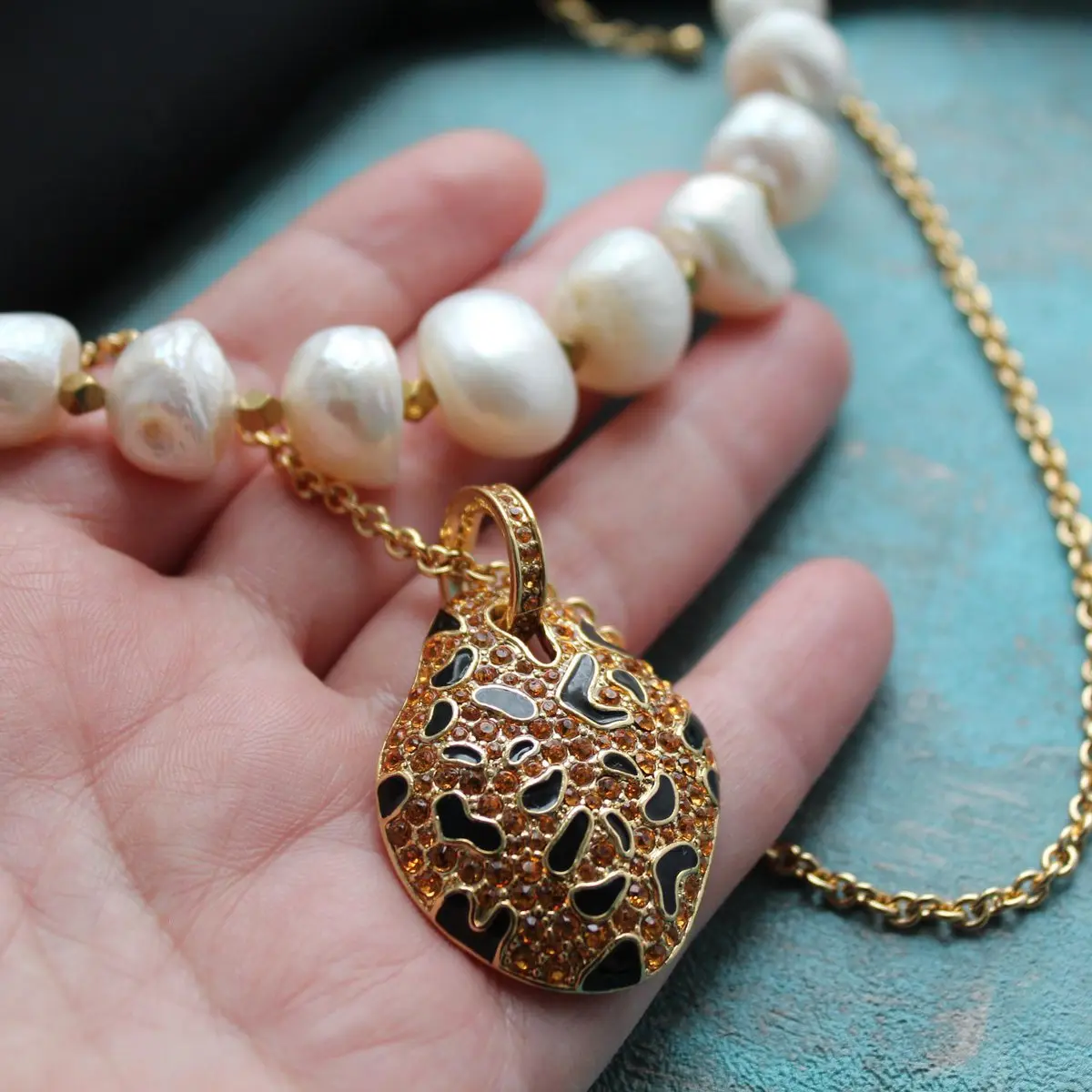 Ожерелье из крупного жемчуга касуми, подвески из эмали, страз, каучука, позолоченной фурнитуры 24К.