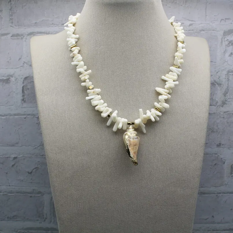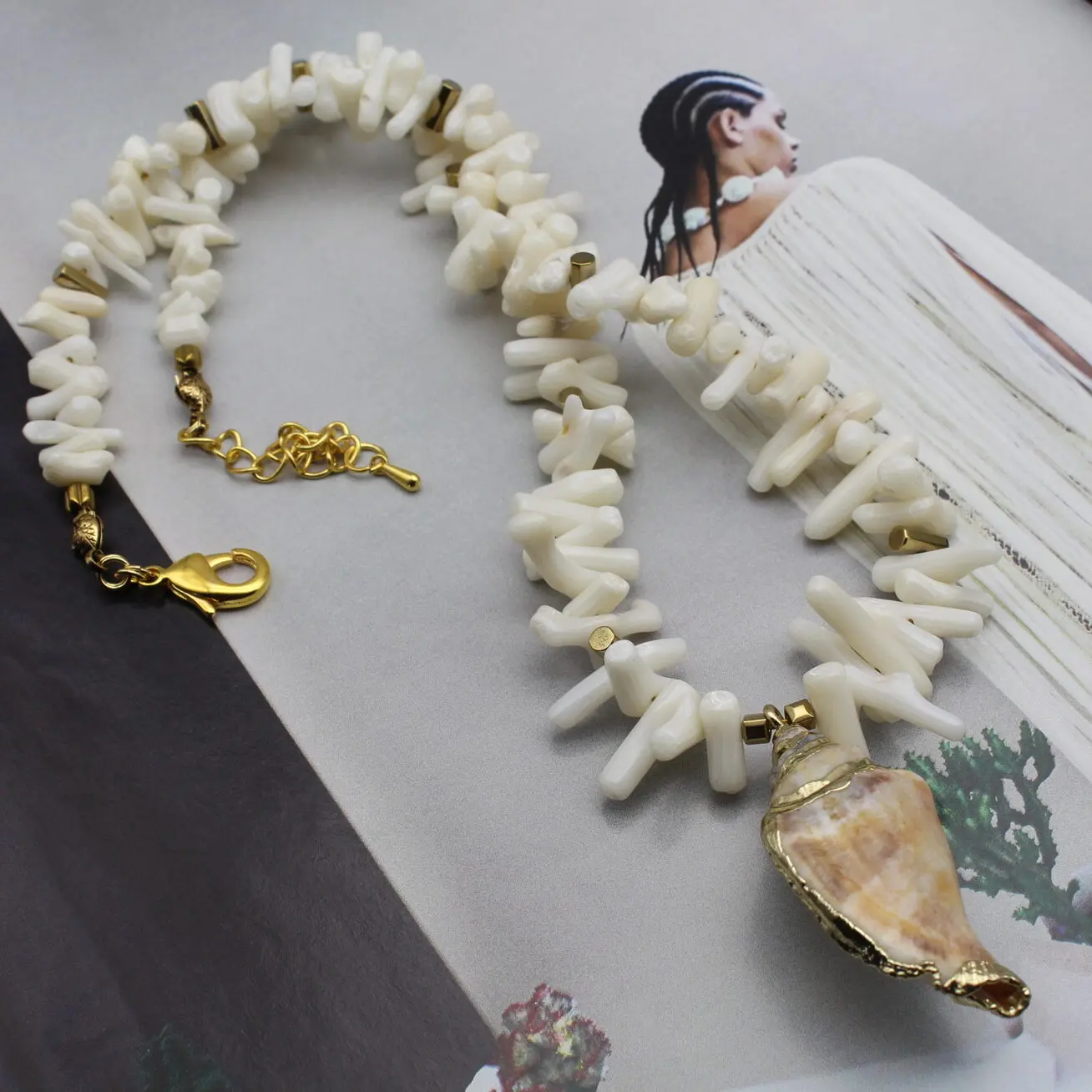 Ожерелье из натурального белого коралла, позолоченной 24К латунной фурнитуры ручной работы, природной ракушки.