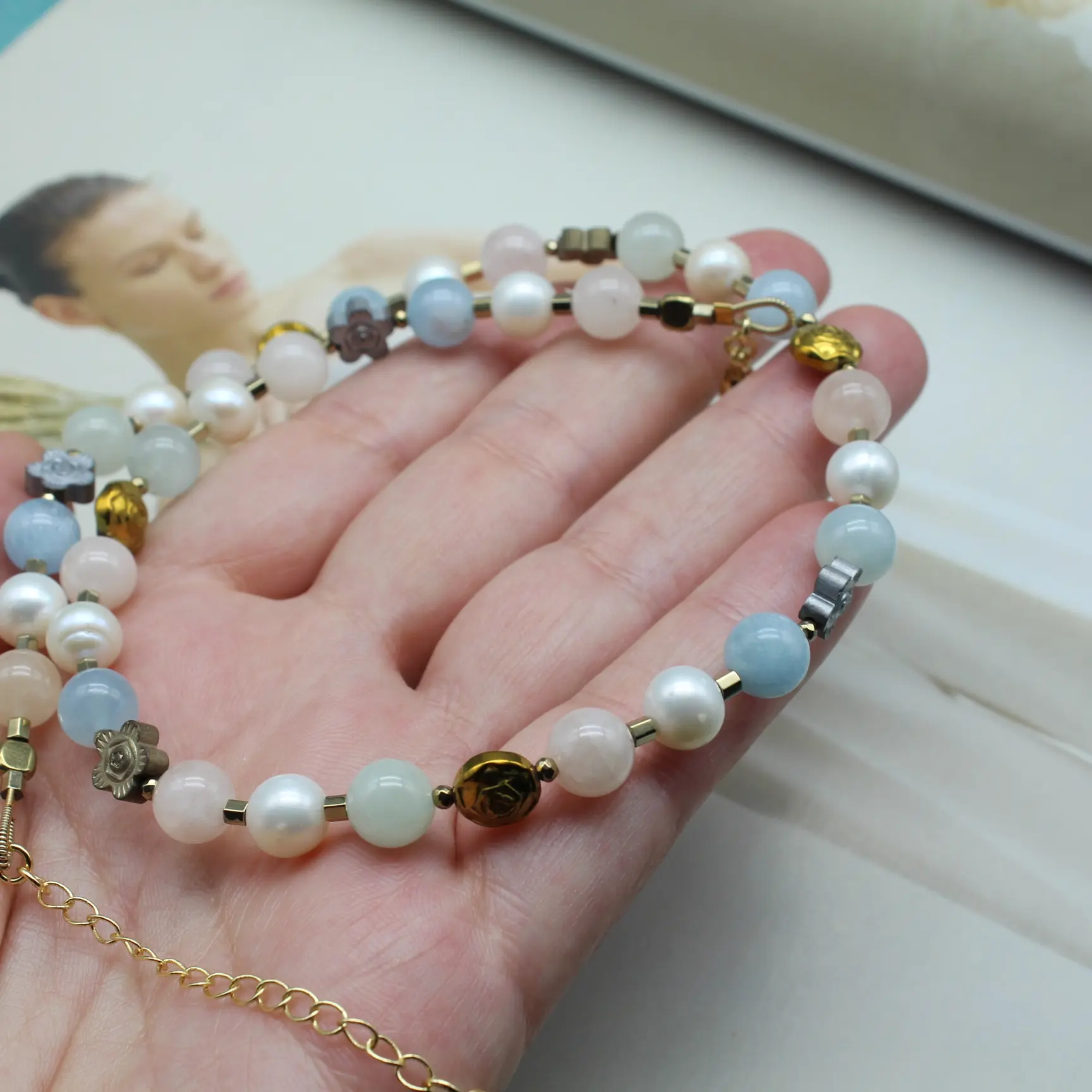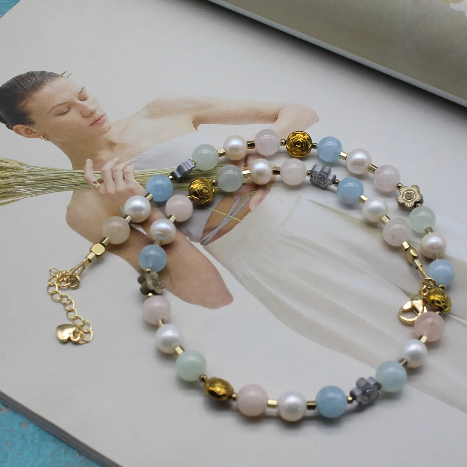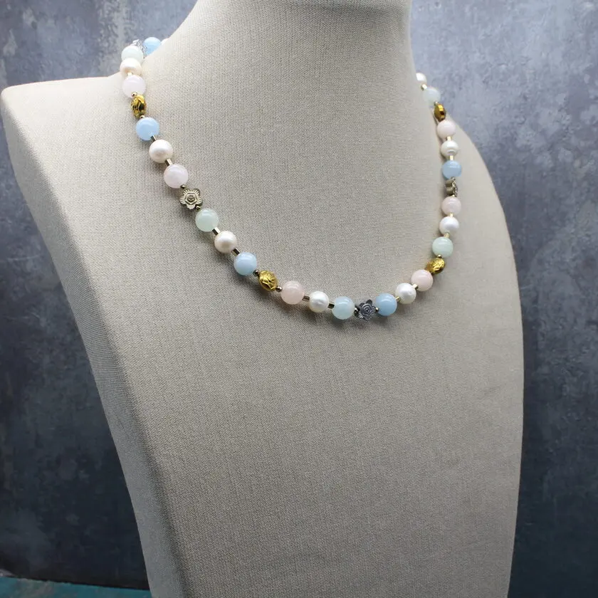 Колье из белого натурального жемчуга, берилла (морганит, аквамарин).