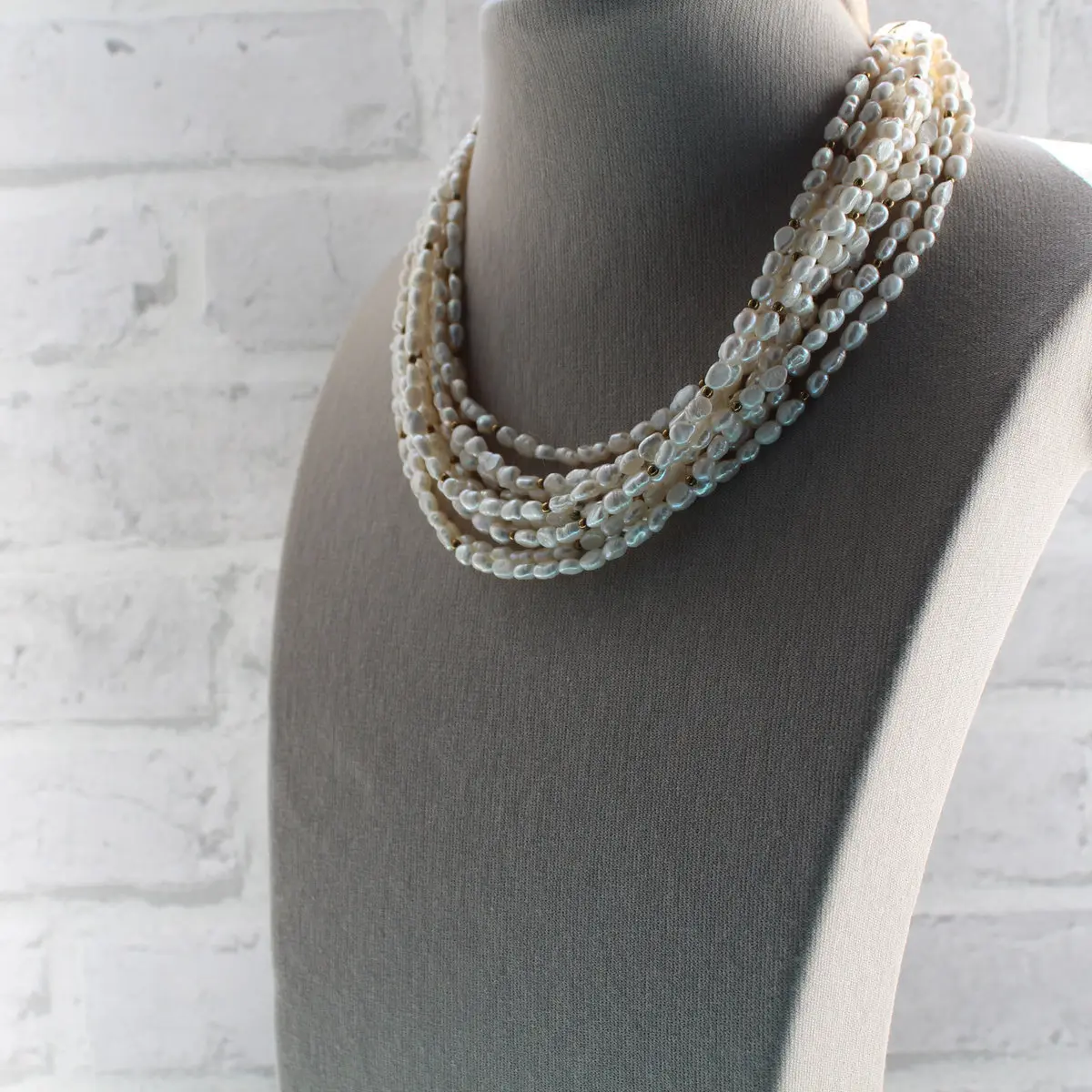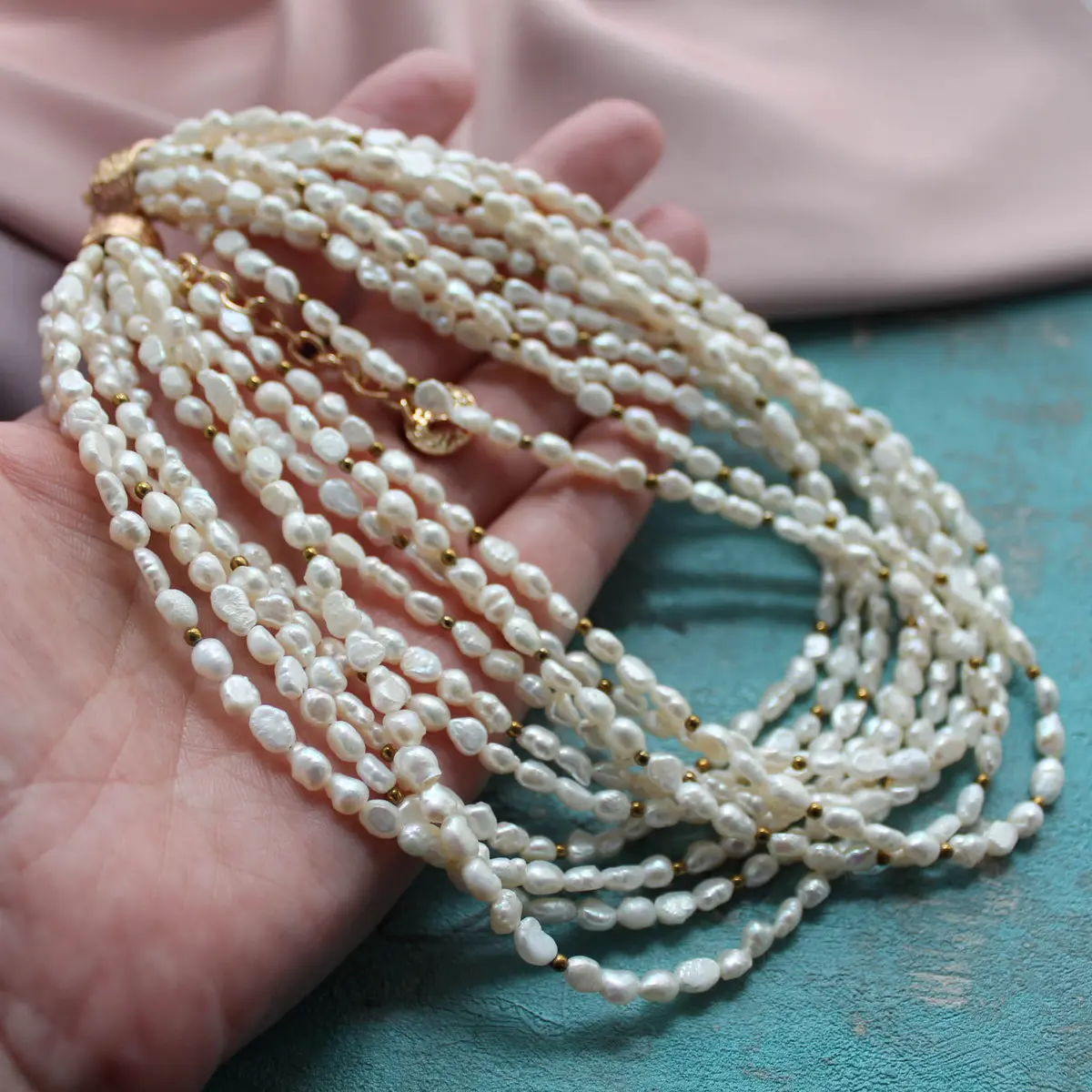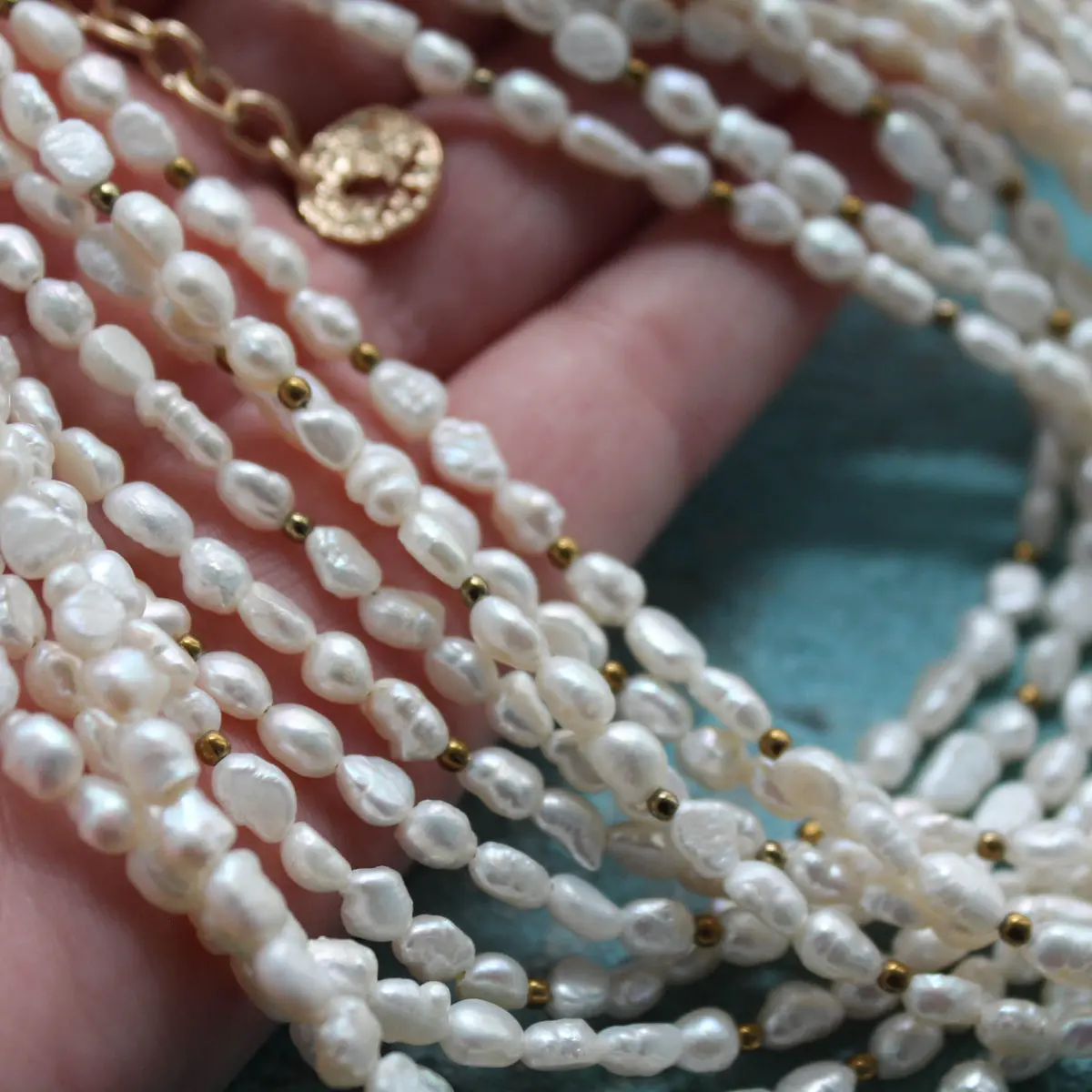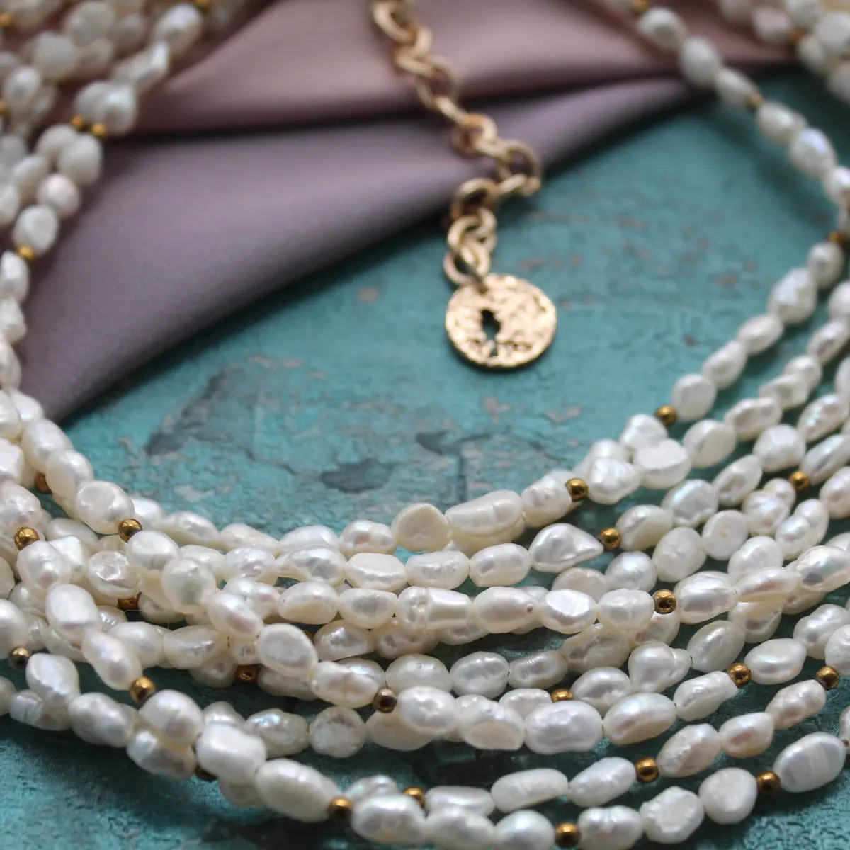 Ожерелье из натурального белоснежного блестящего речного жемчуга барочной формы, позолоченной латуни.