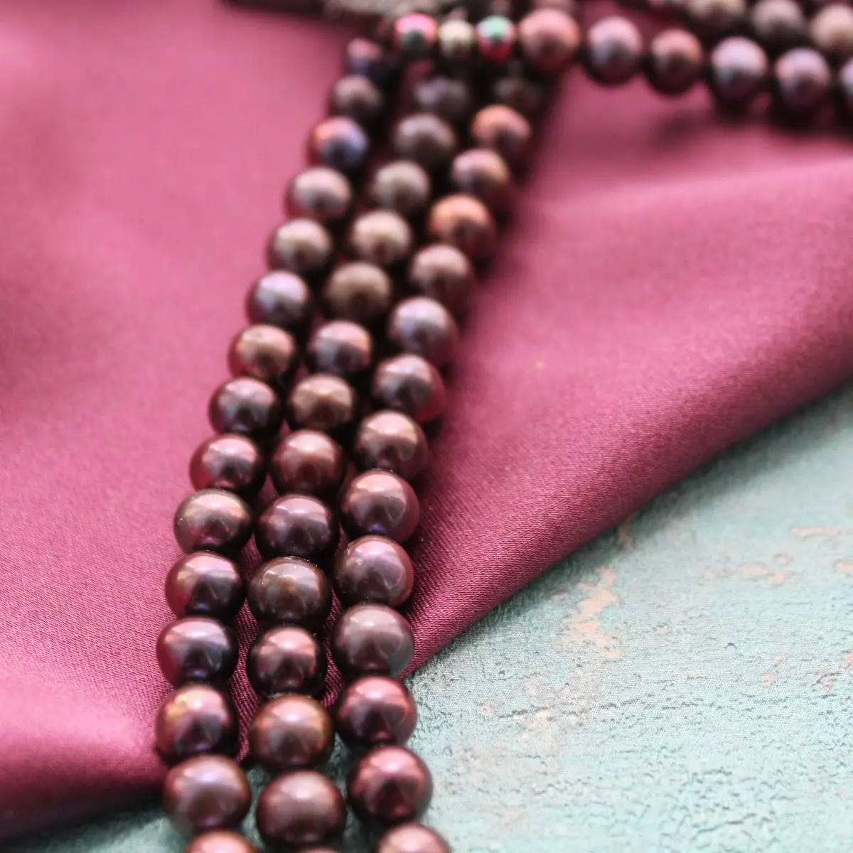 Ожерелье из натуральных жемчужин темно-лилового оттенка с розовыми, золотистыми обертонами, родированной, фурнитуры, инкрустированной микроцирконами.
