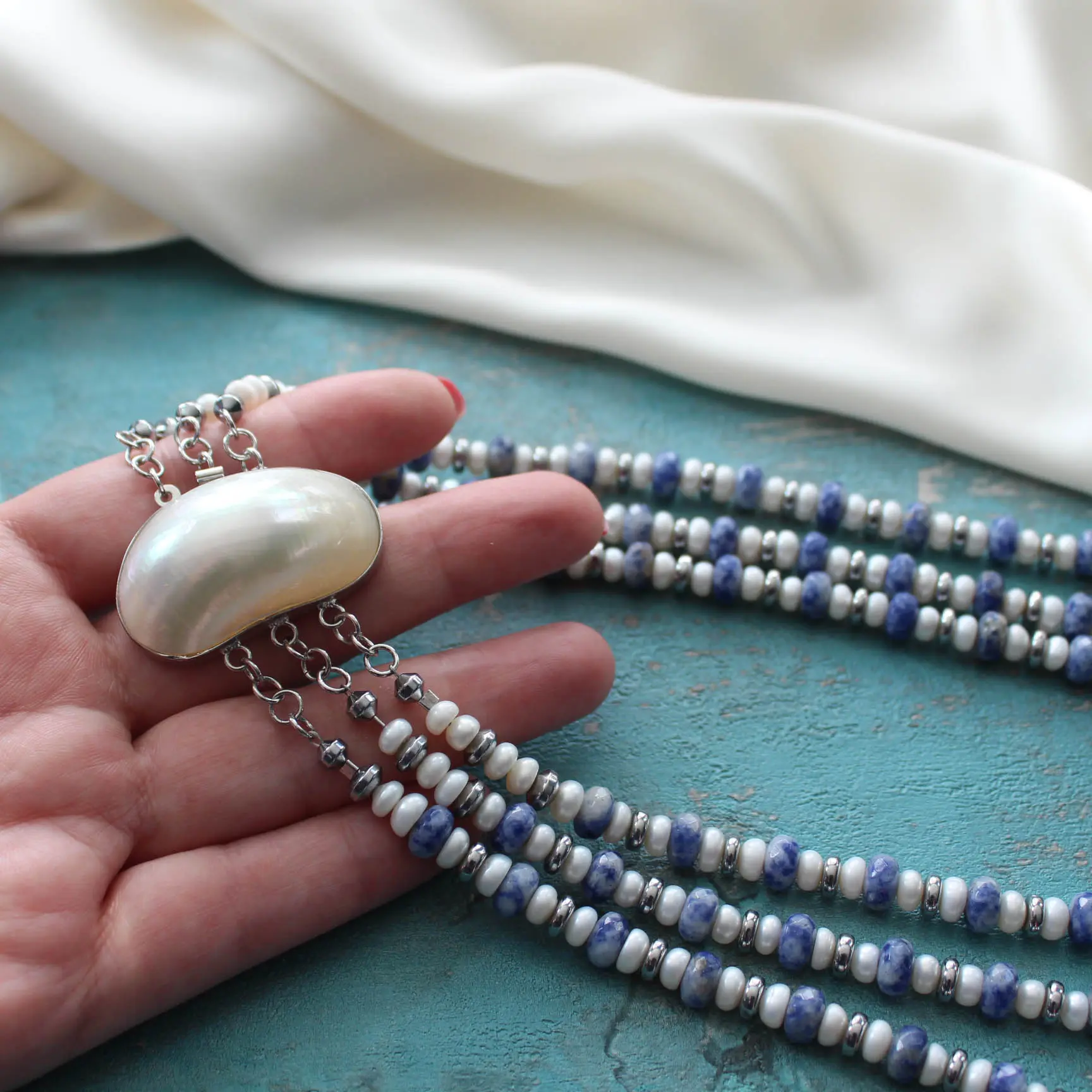 Ожерелье из плоского белого жемчуга, содалита, родированной, фурнитуры с перламутром.