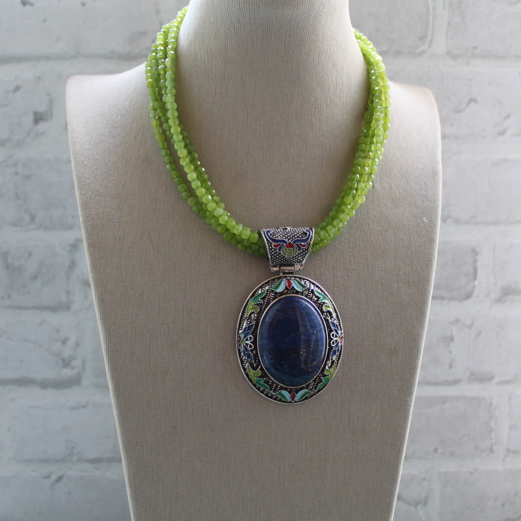 Ожерелье из зеленого халцедона, подвески с натуральным лазуритом и эмалью.