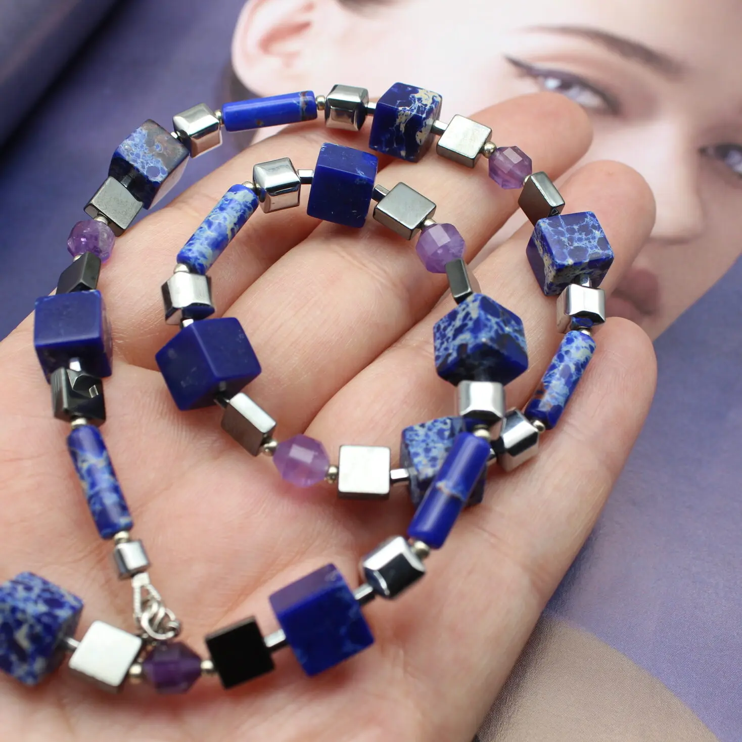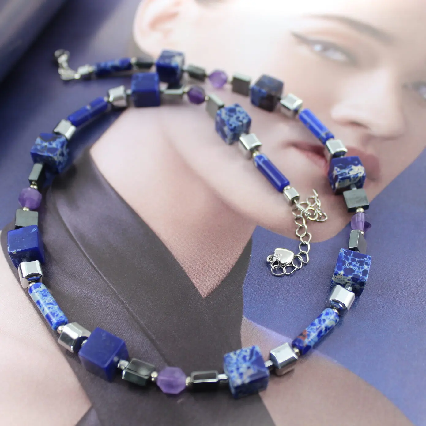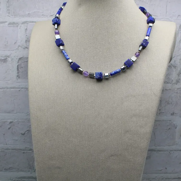 Ожерелье из натурального аметиста, варисцита, гематита, родиевое покрытие.