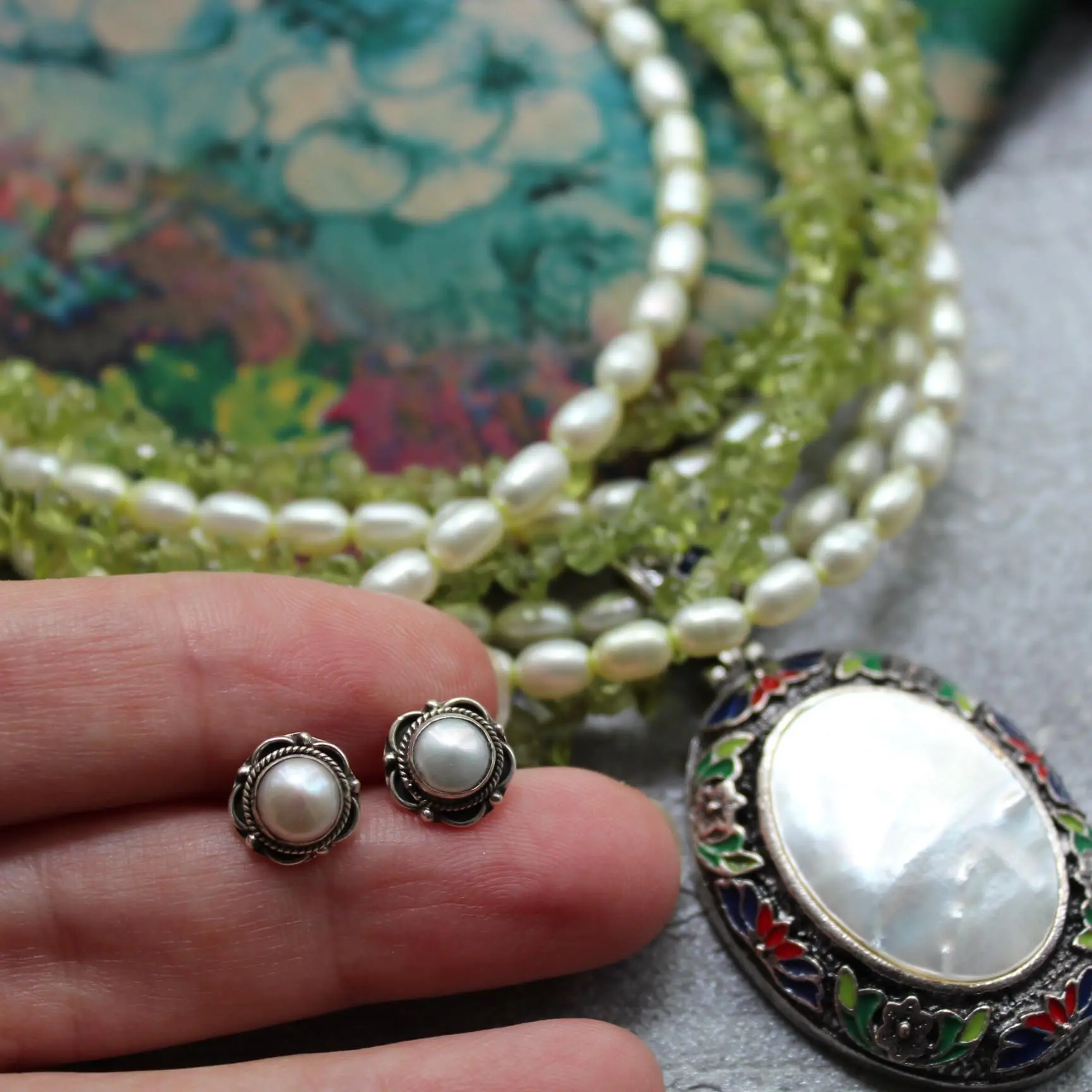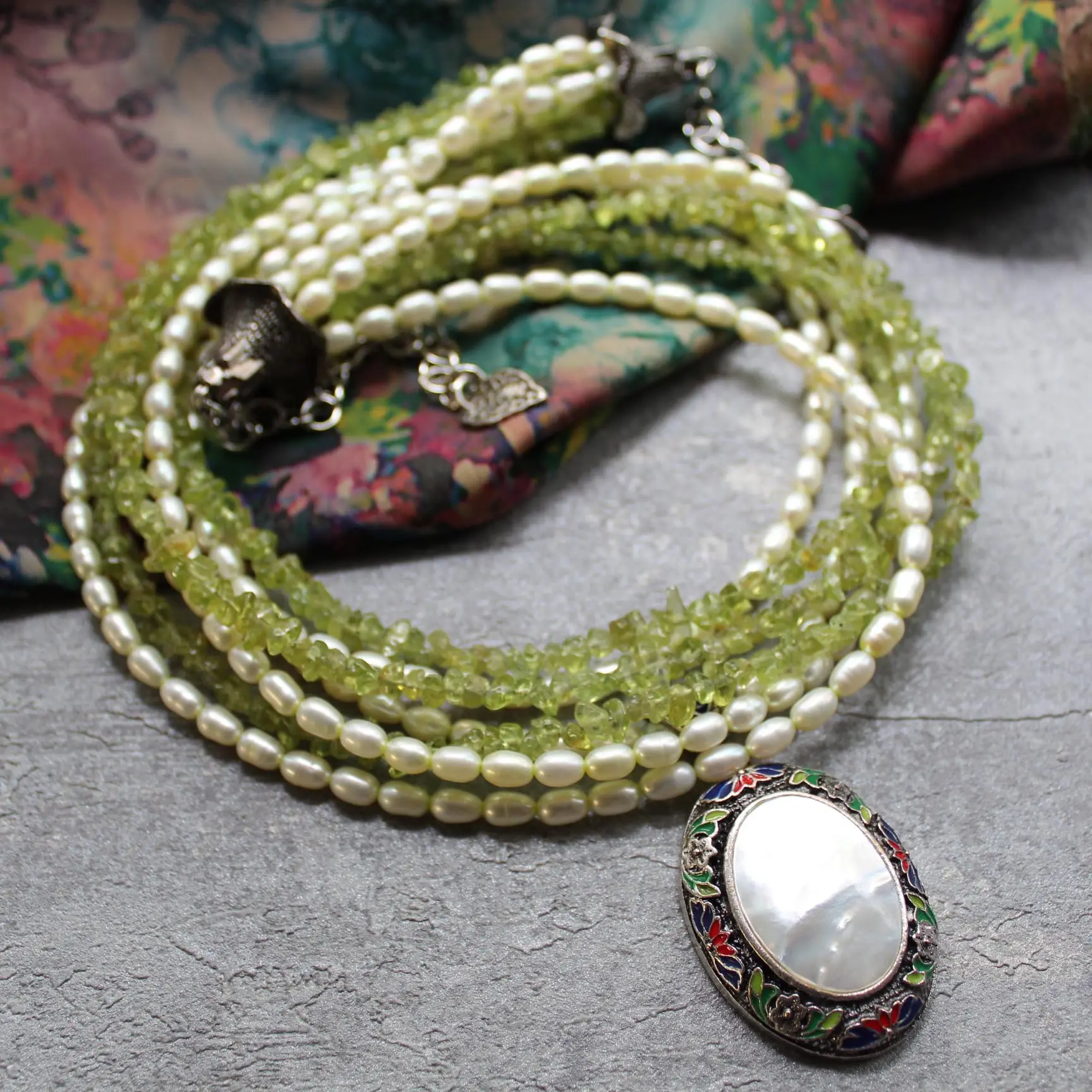 Ожерелье из натурального жемчуга, хризолита, подвески с натуральным перламутром и эмалью, посеребренной, родированной фурнитуры.