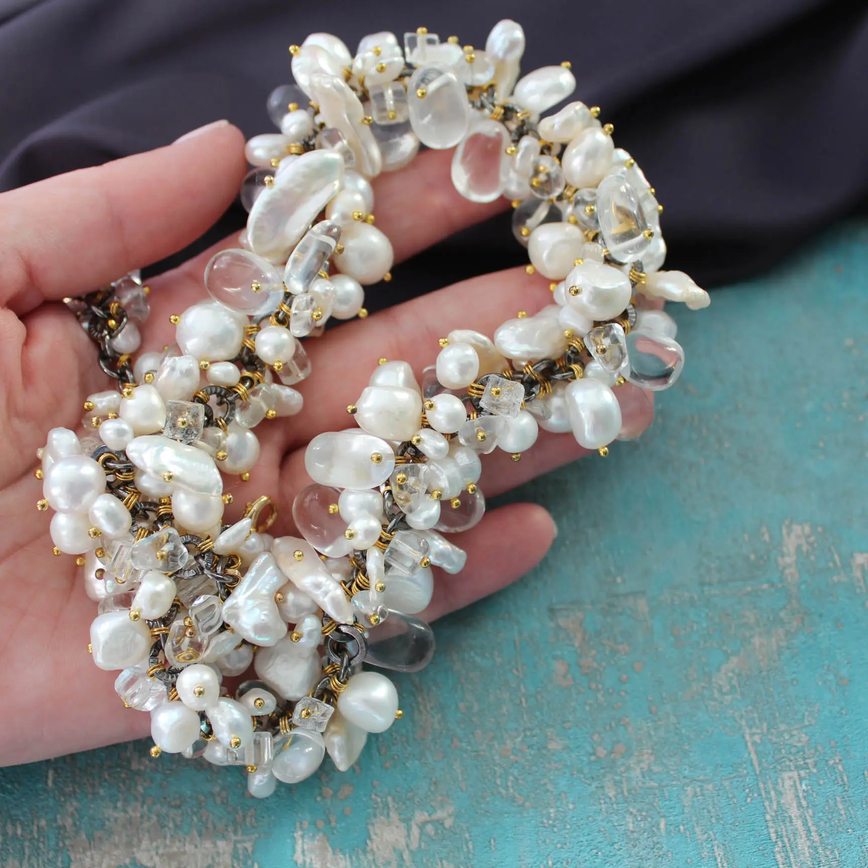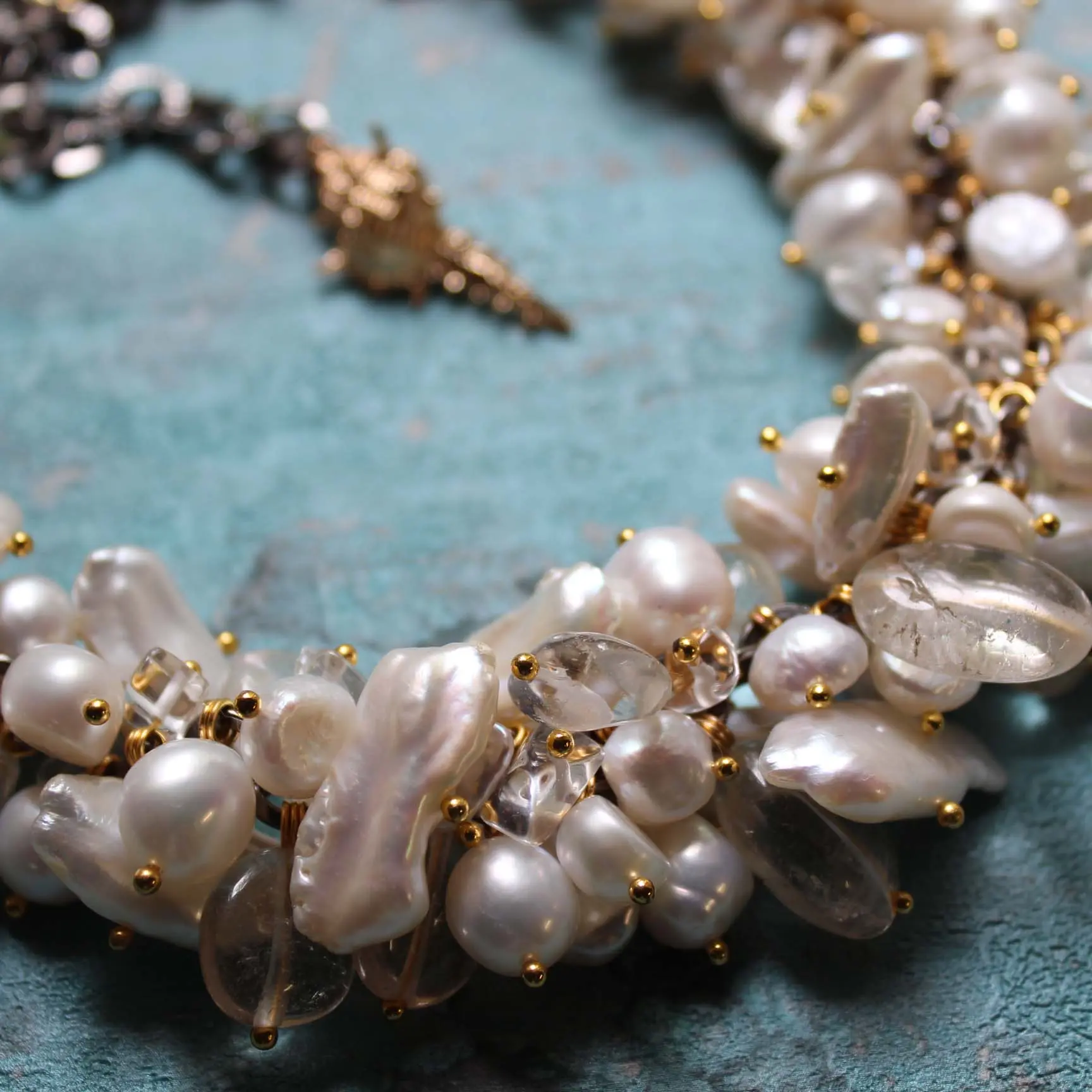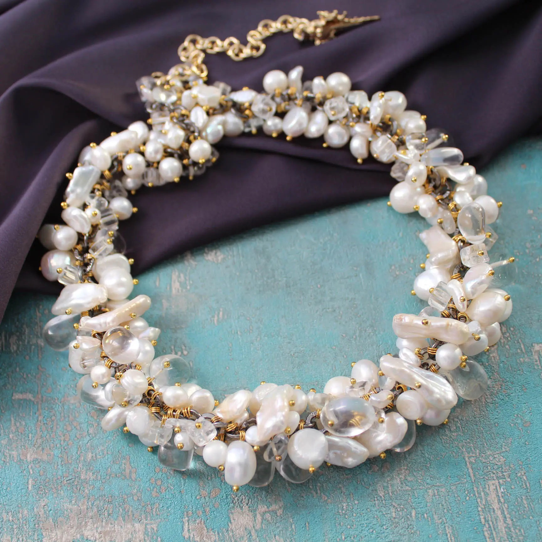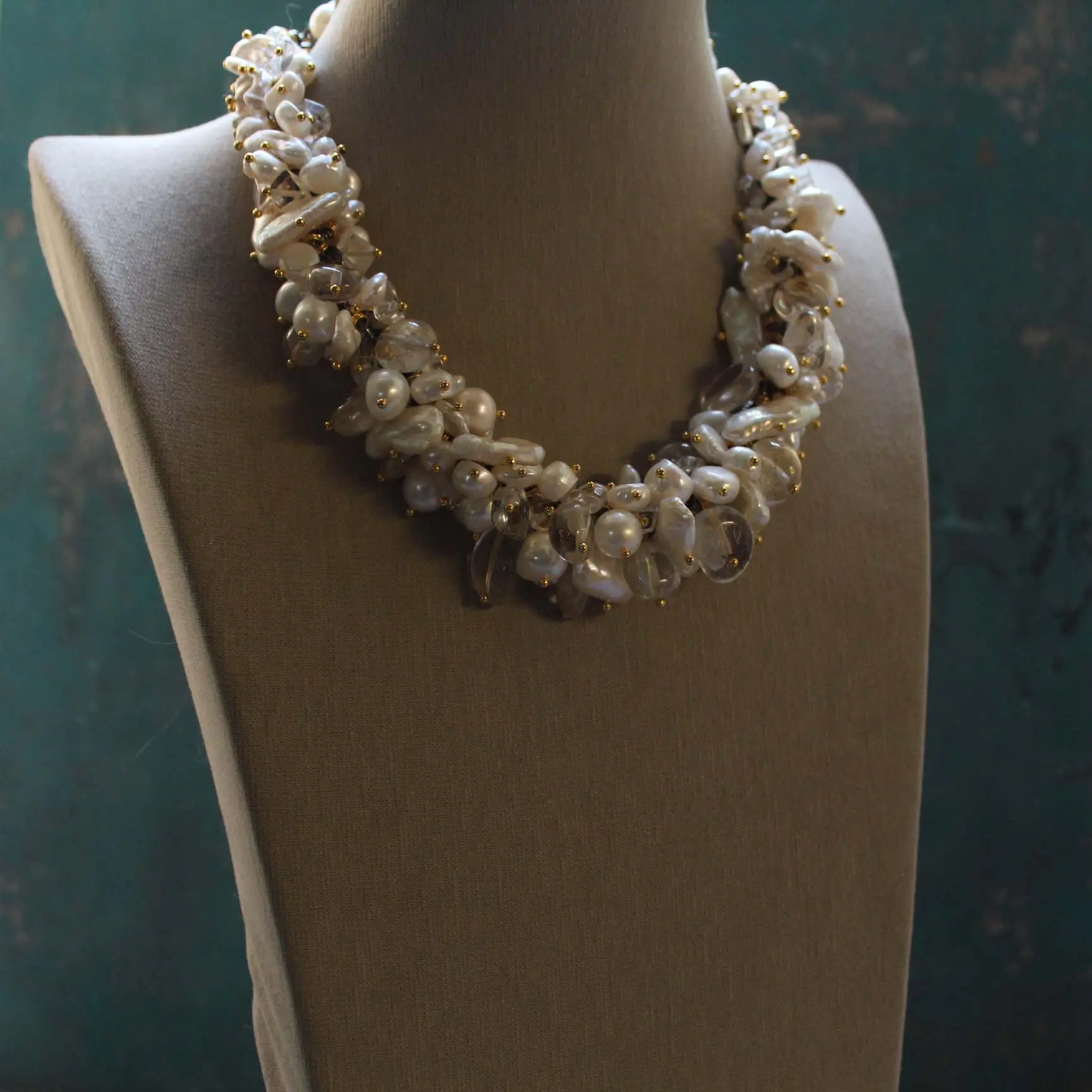 Ожерелье из натурального жемчуга четырех видов - барочного, кейши, круглого, гигантского кейши, горного хрусталя.