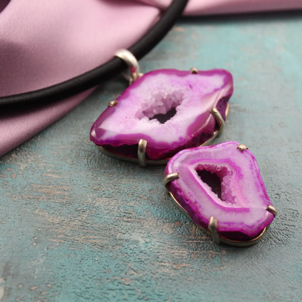 Подвеска из розовой друзы кварца, посеребрение 925 пробы.