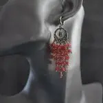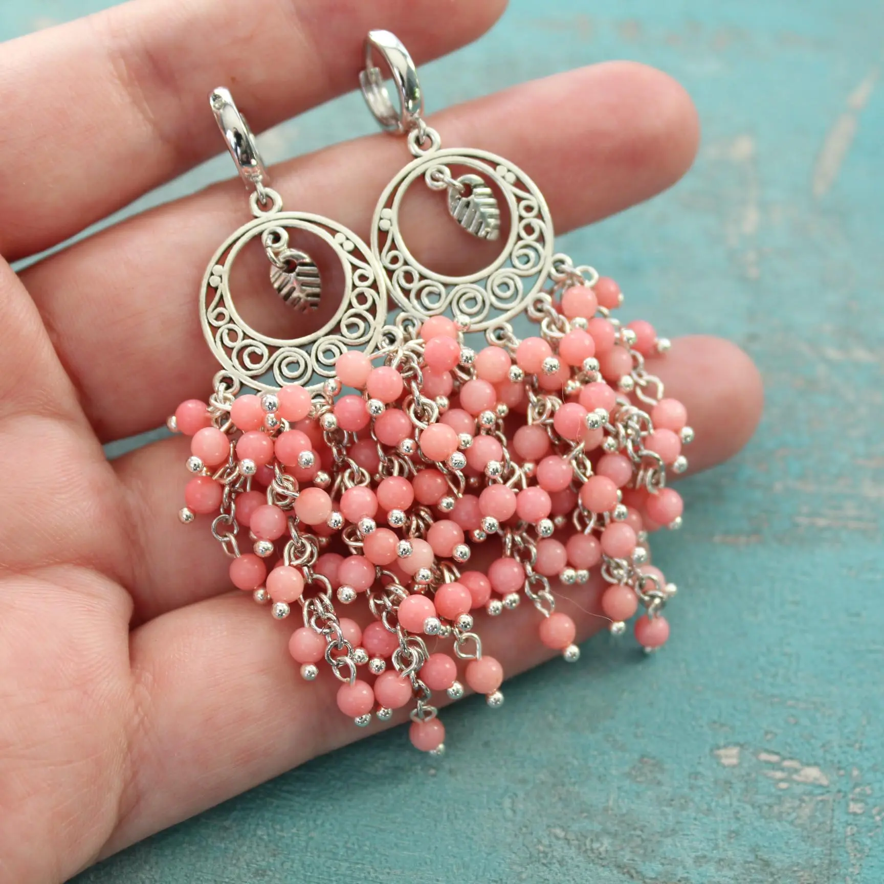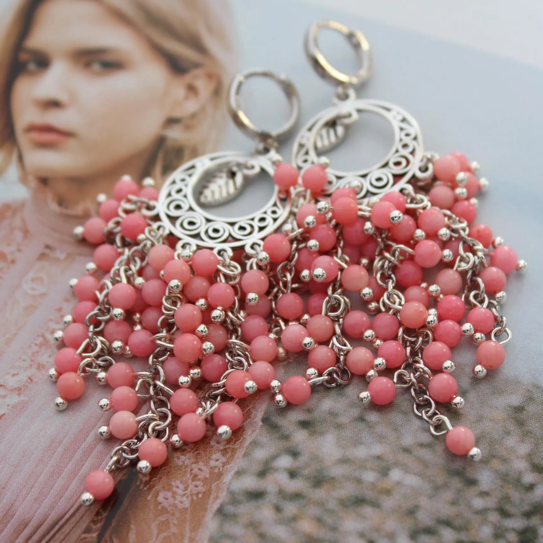 Серьги из натурального розового коралла, посеребренной родированной фурнитуры, серебра 925.