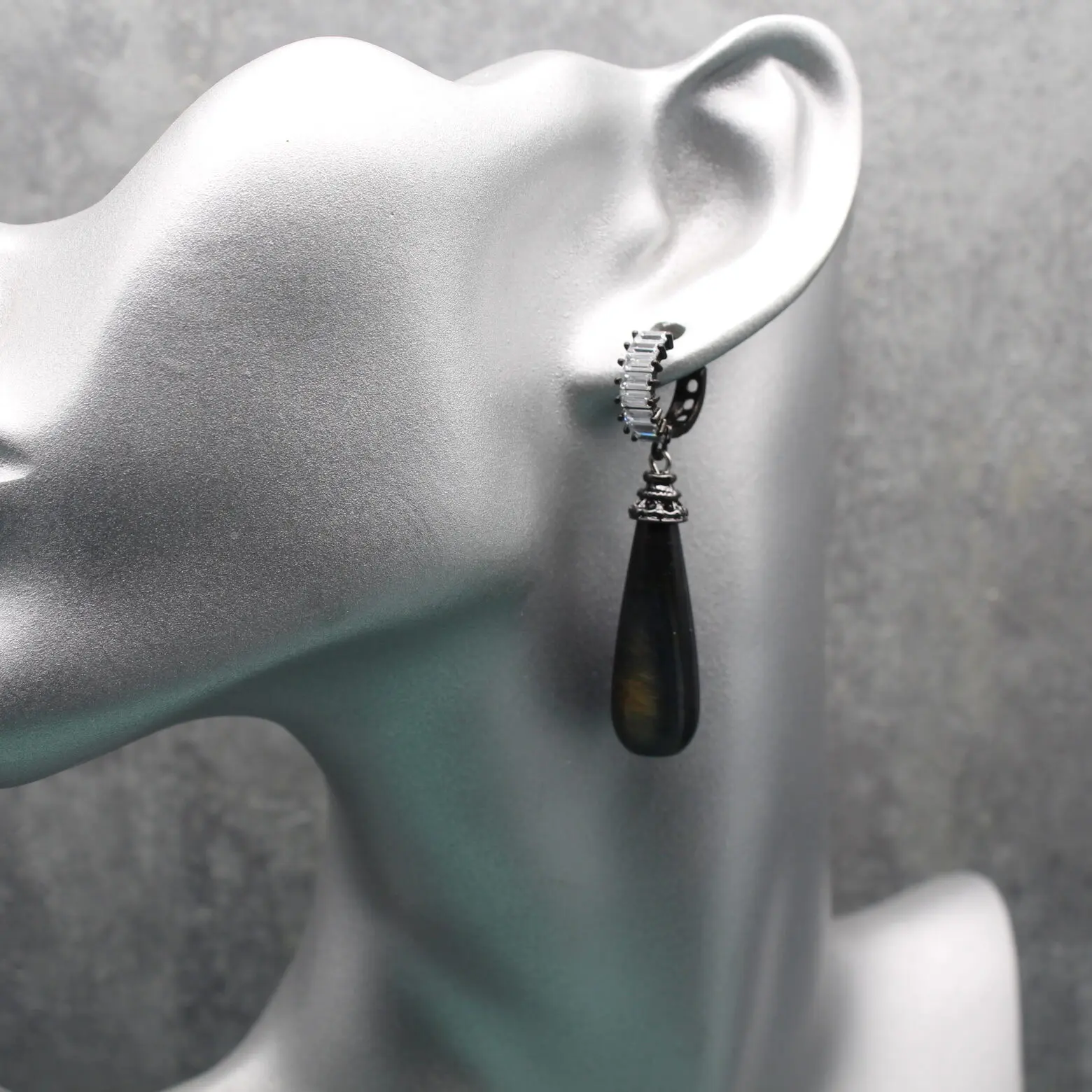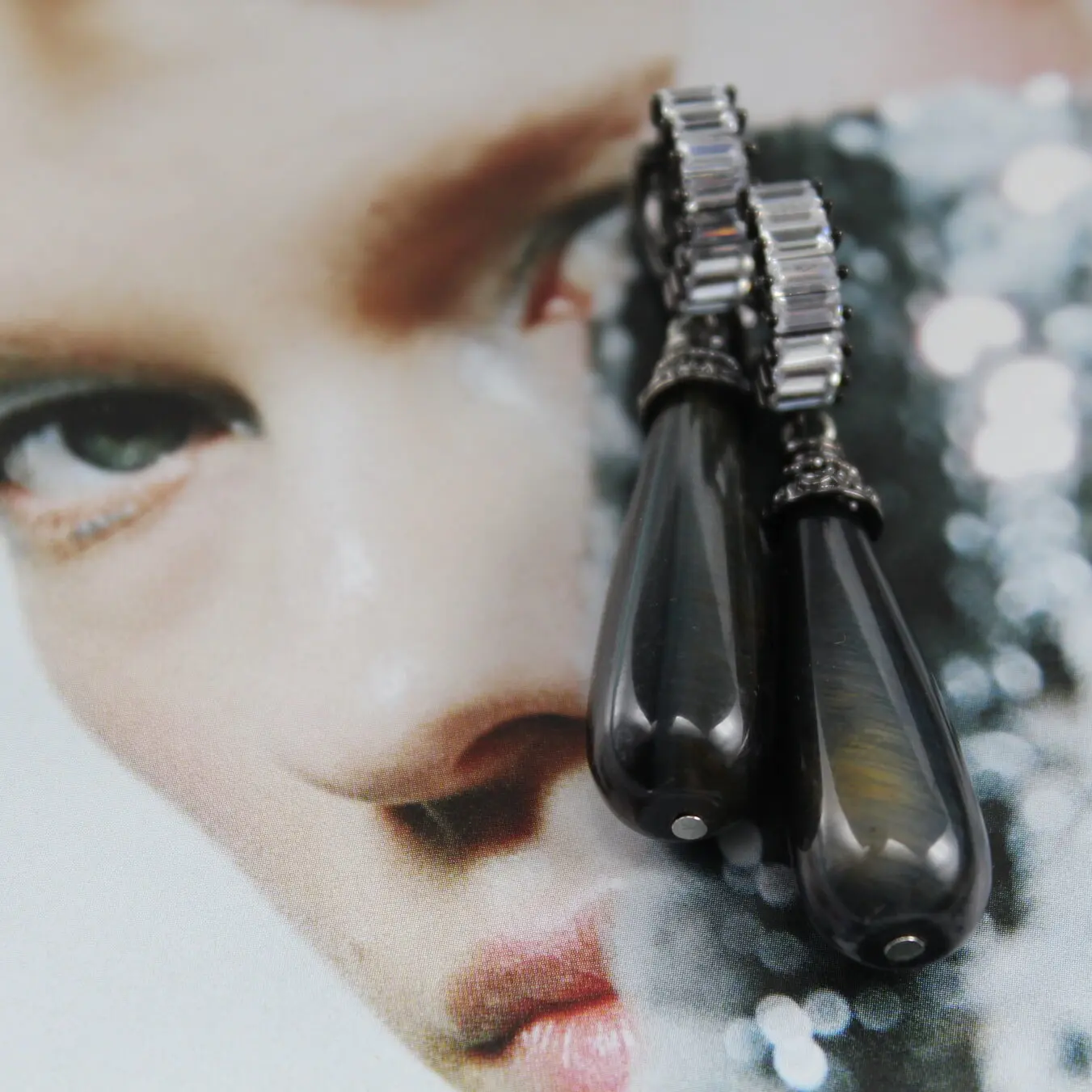 Серьги из соколинного глаза, чернение, серебра 925 с родиевым покрытием, цирконы.