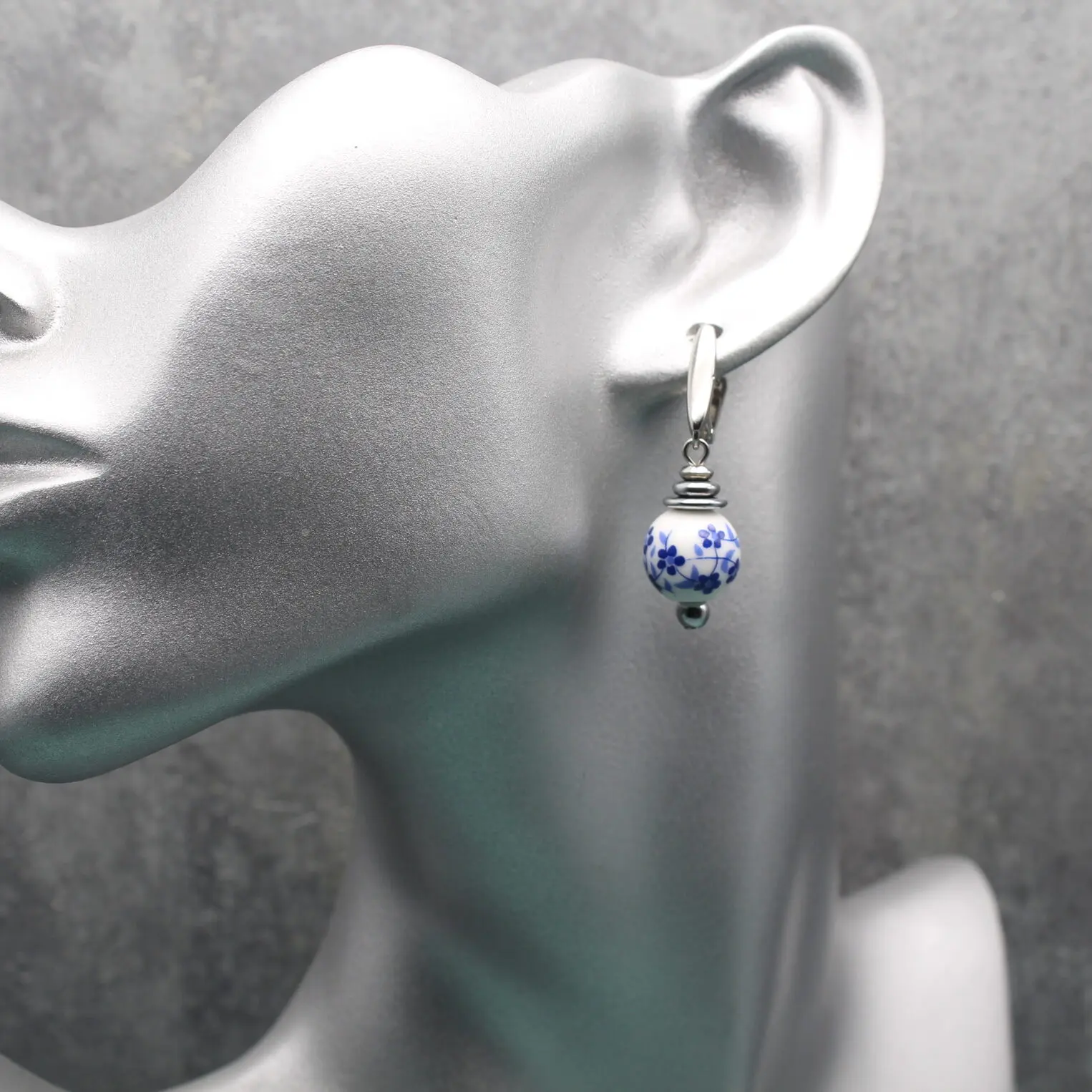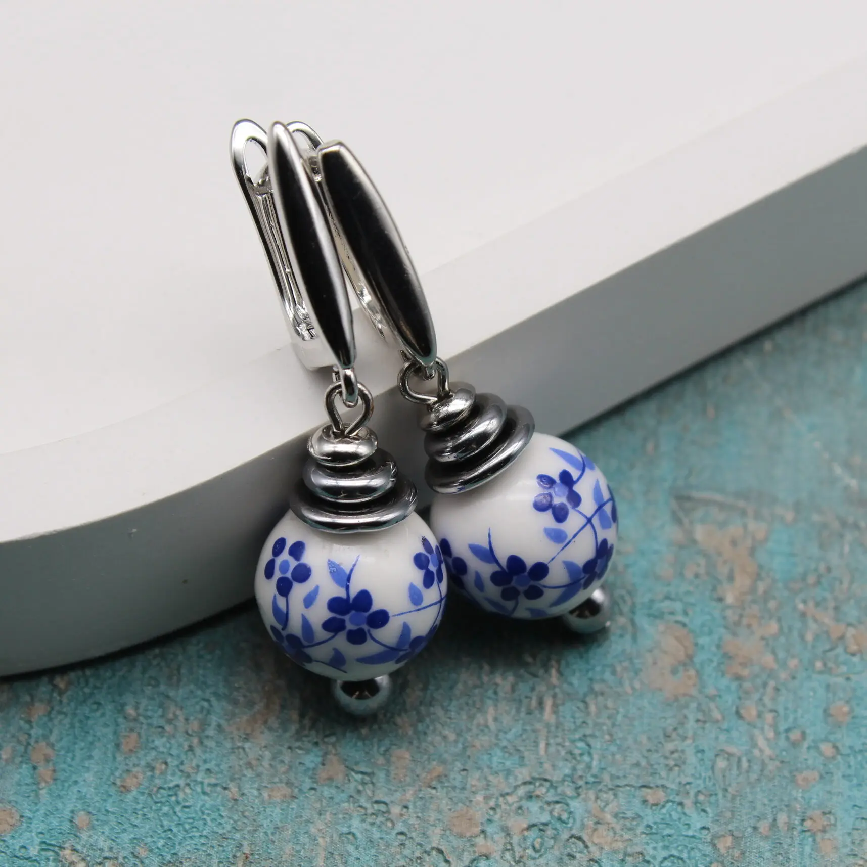 Серьги из расписного фарфора, гематита, посеребренной родированной фурнитуры.