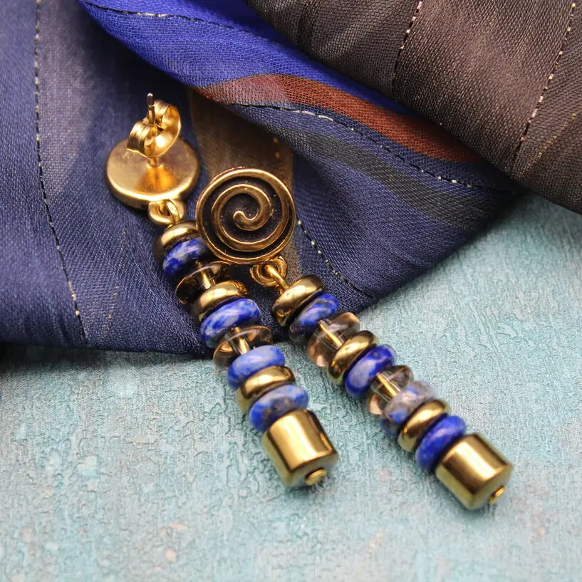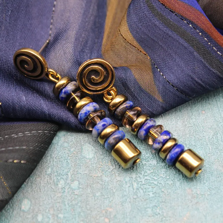 Серьги из натурального лазурита, дымчатого кварца, гематита, позолоченной 24К фурнитуры.