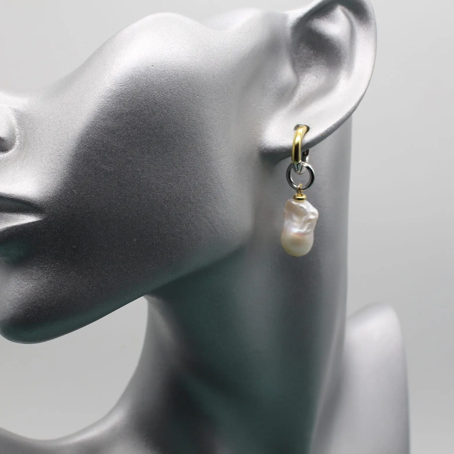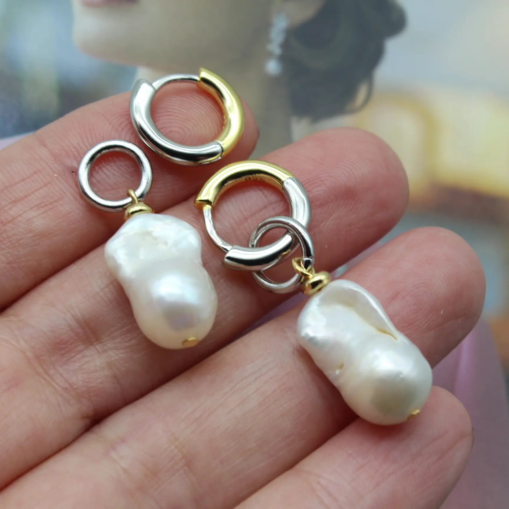 Серьги-трансформеры из барочного белого жемчуга, посеребренной и позолоченной родированной фурнитуры.