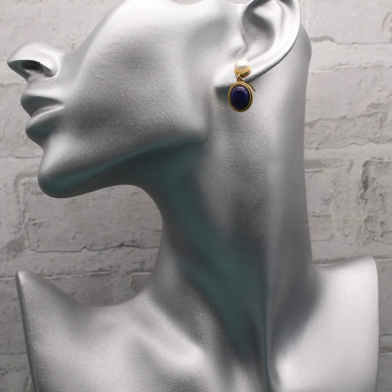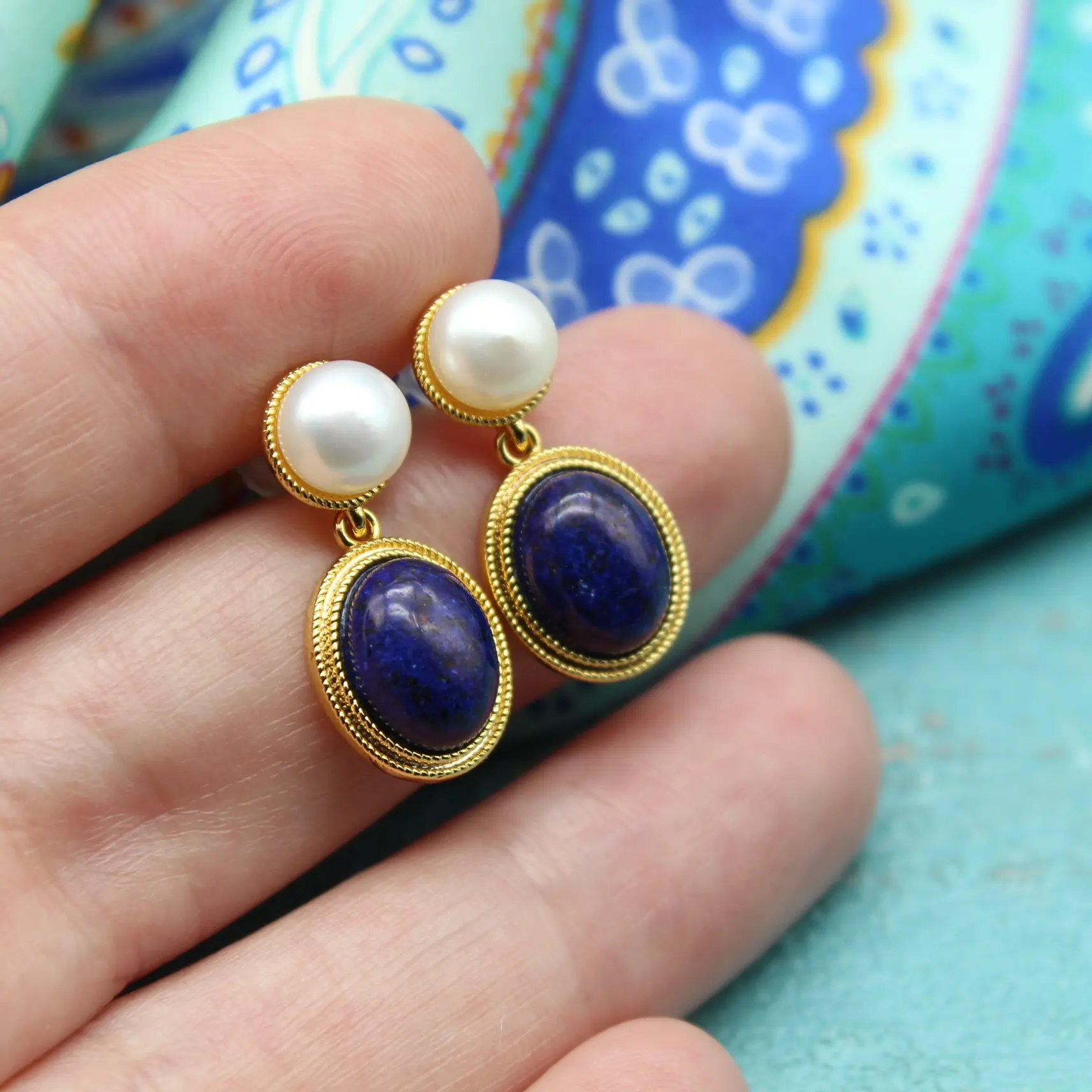 Серьги из натурального белого жемчуга, лазурита, позолоченного сплава.