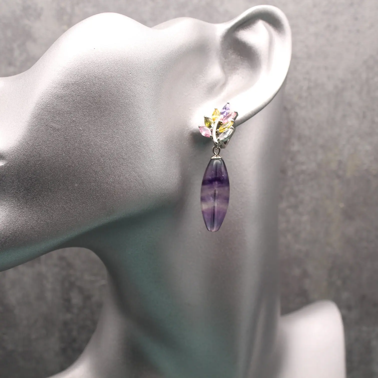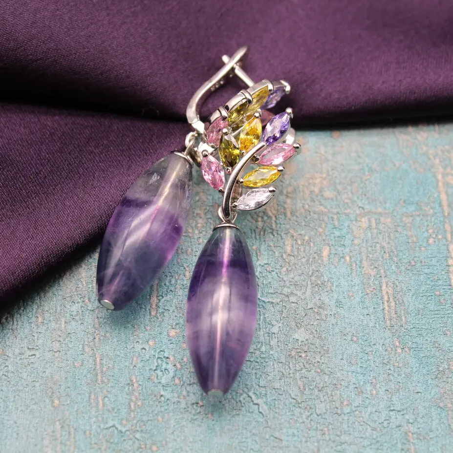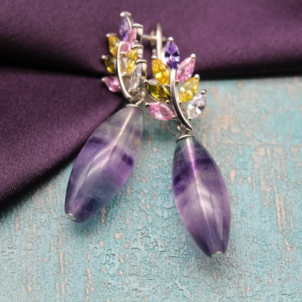 Серьги из природного флюорита, посеребрение 925, родирование, цветные цирконы.