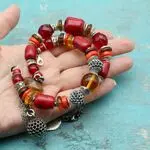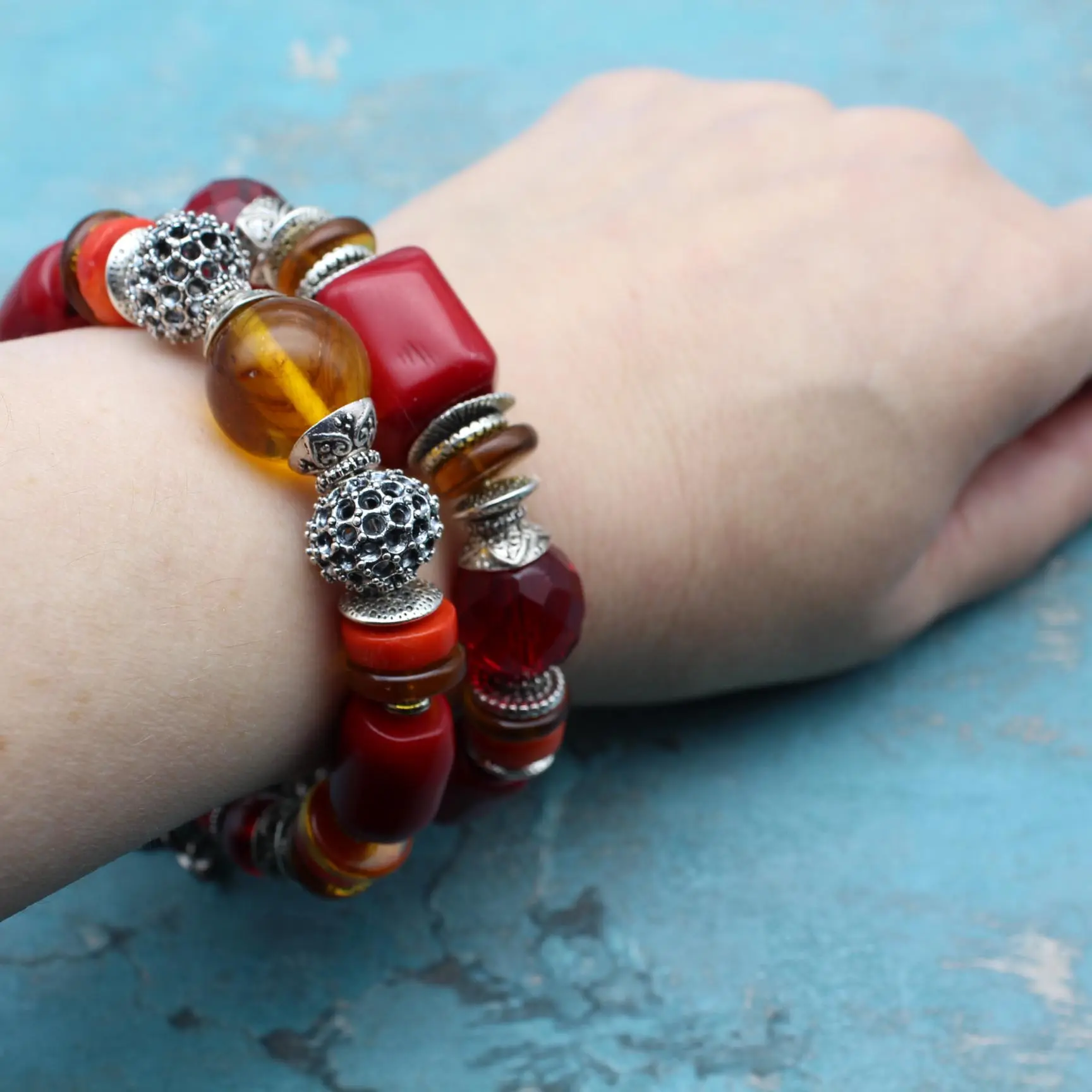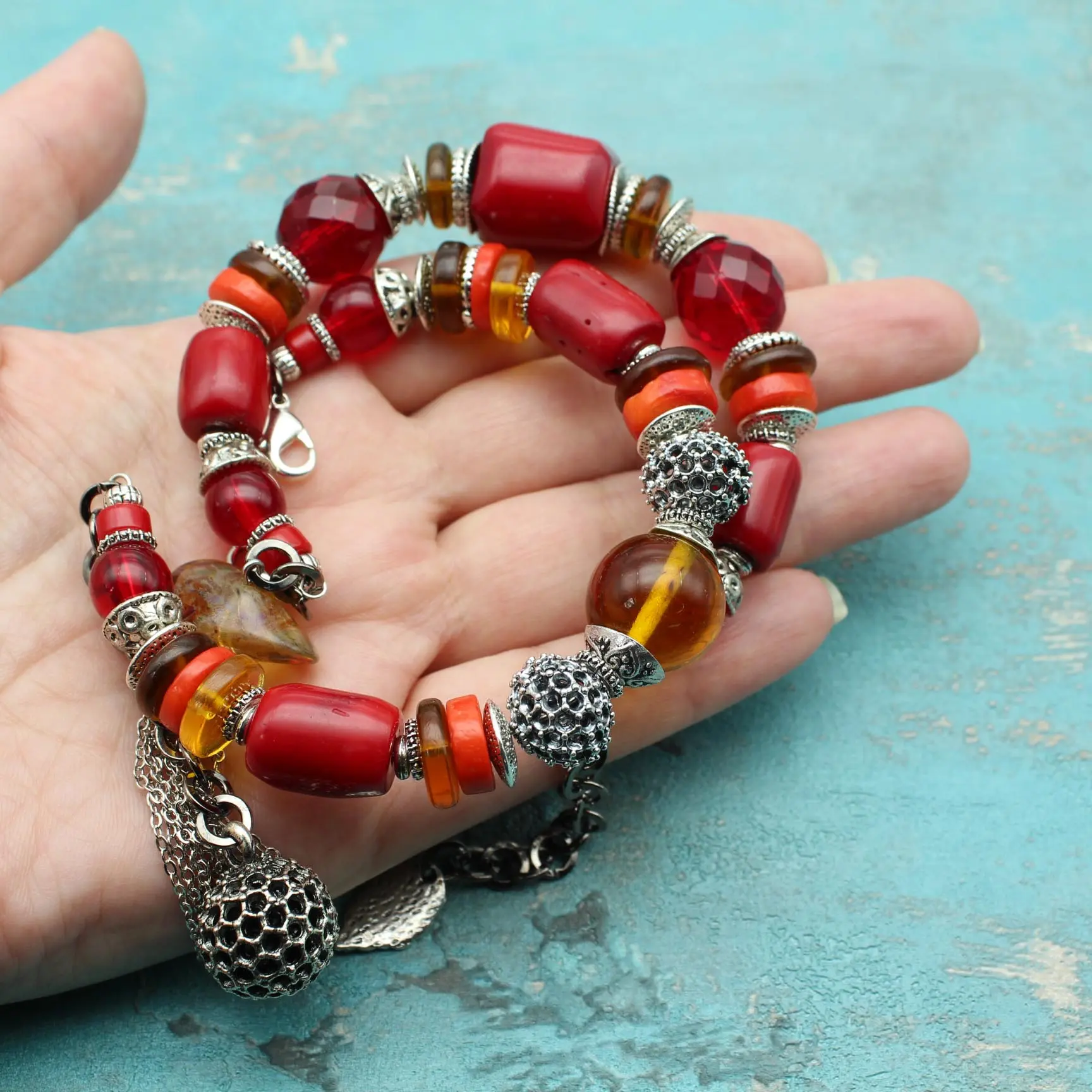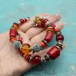 Сет браслетов из натурального крупного красного коралла, янтаря, богемского стекла, орнаментированных бусин, посеребренной фурнитуры.
