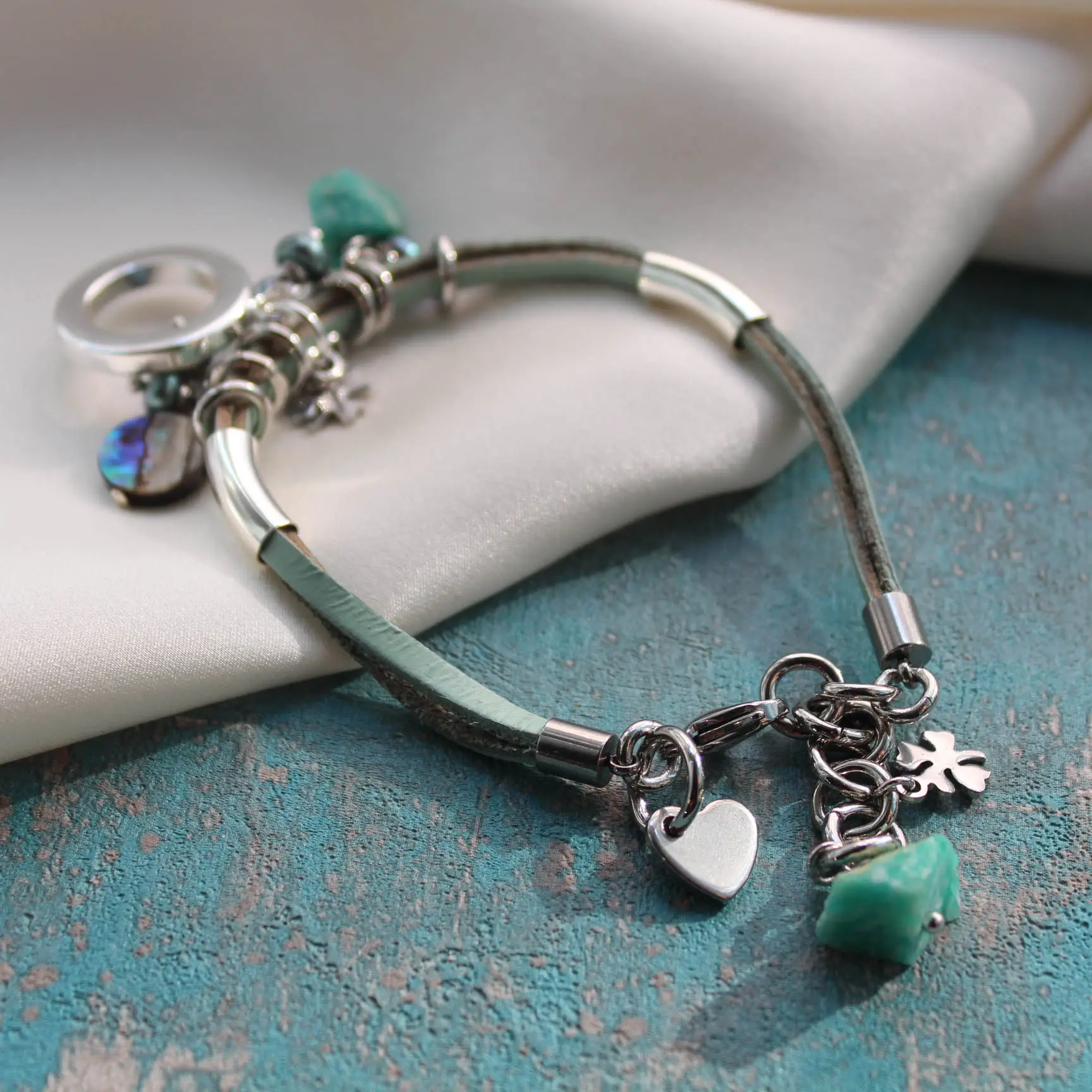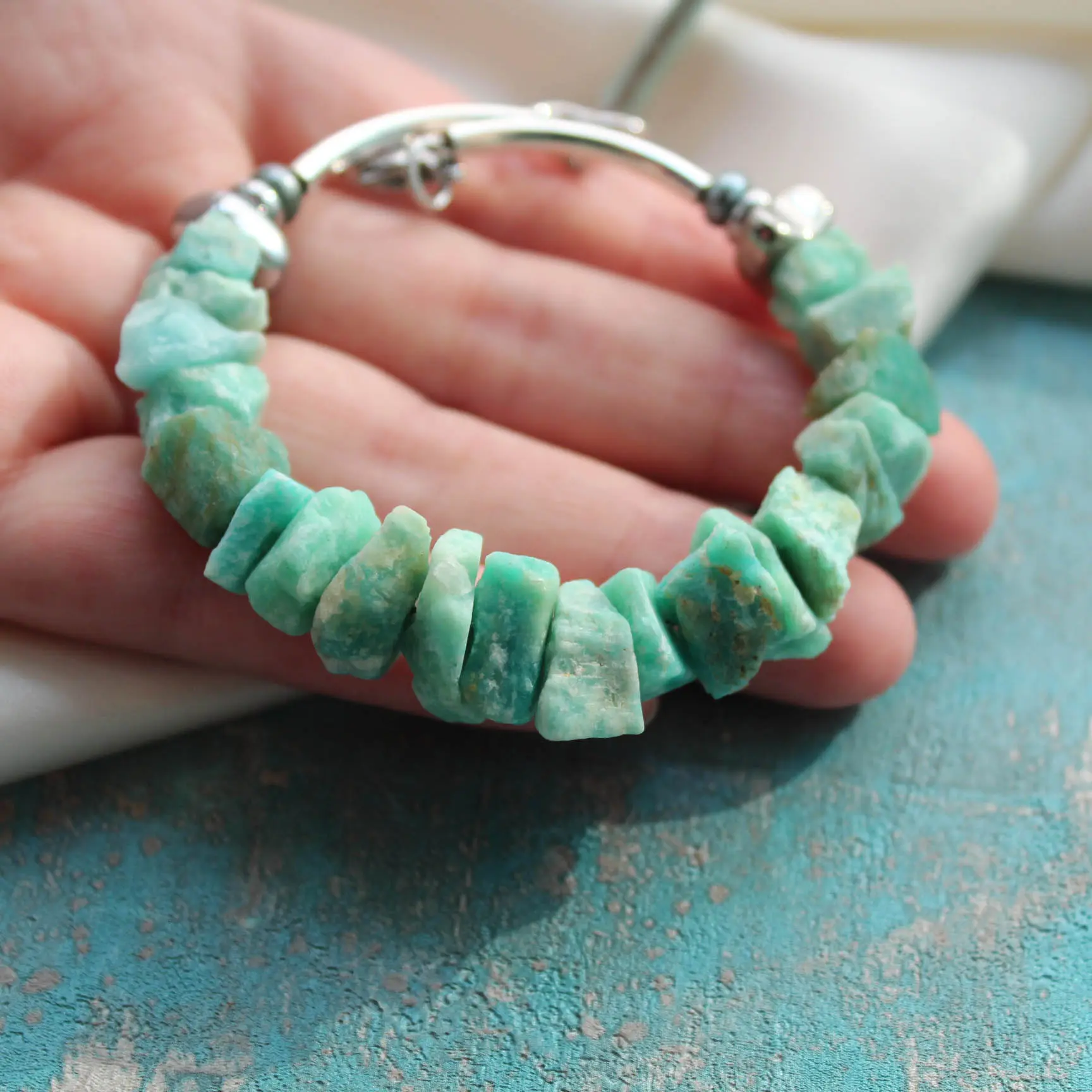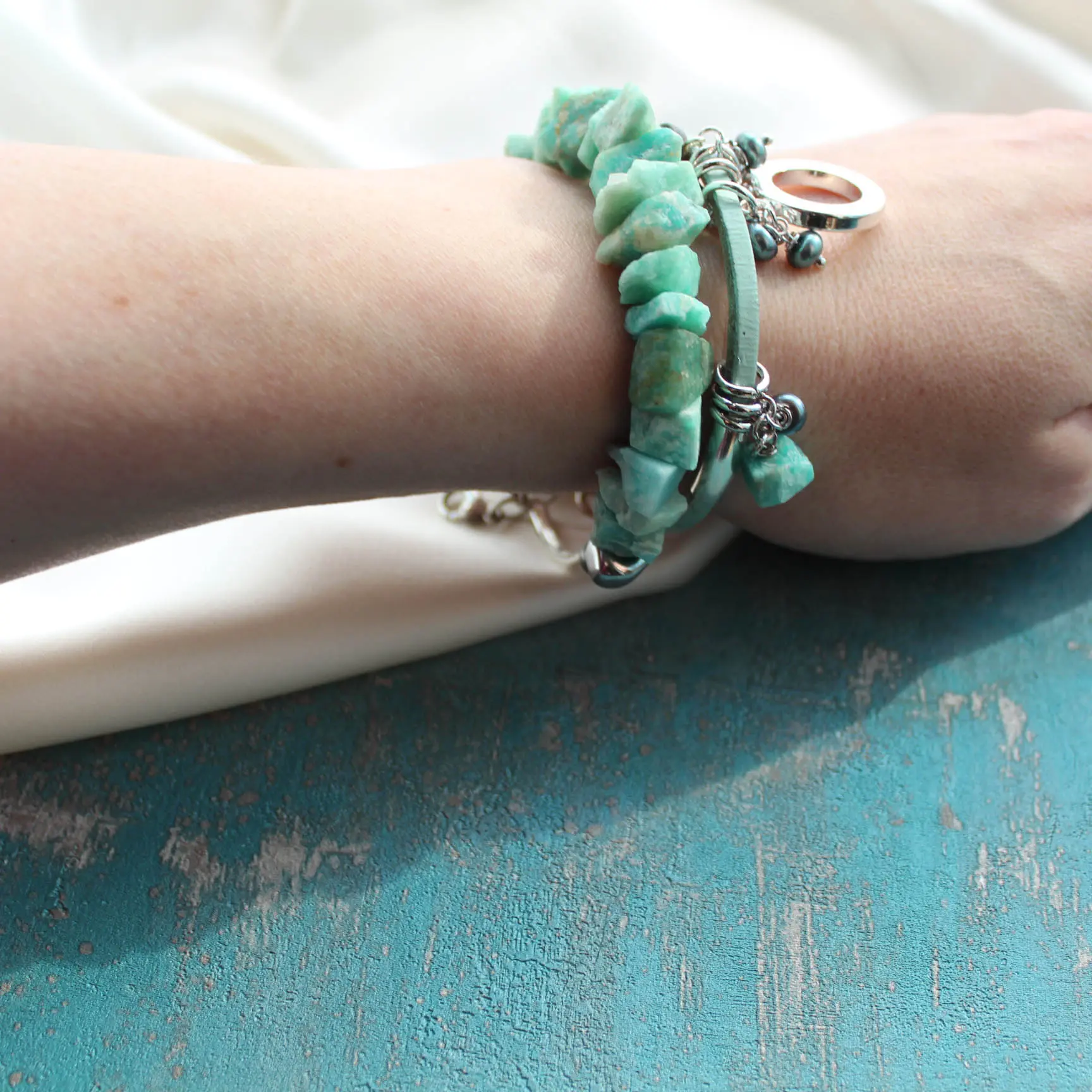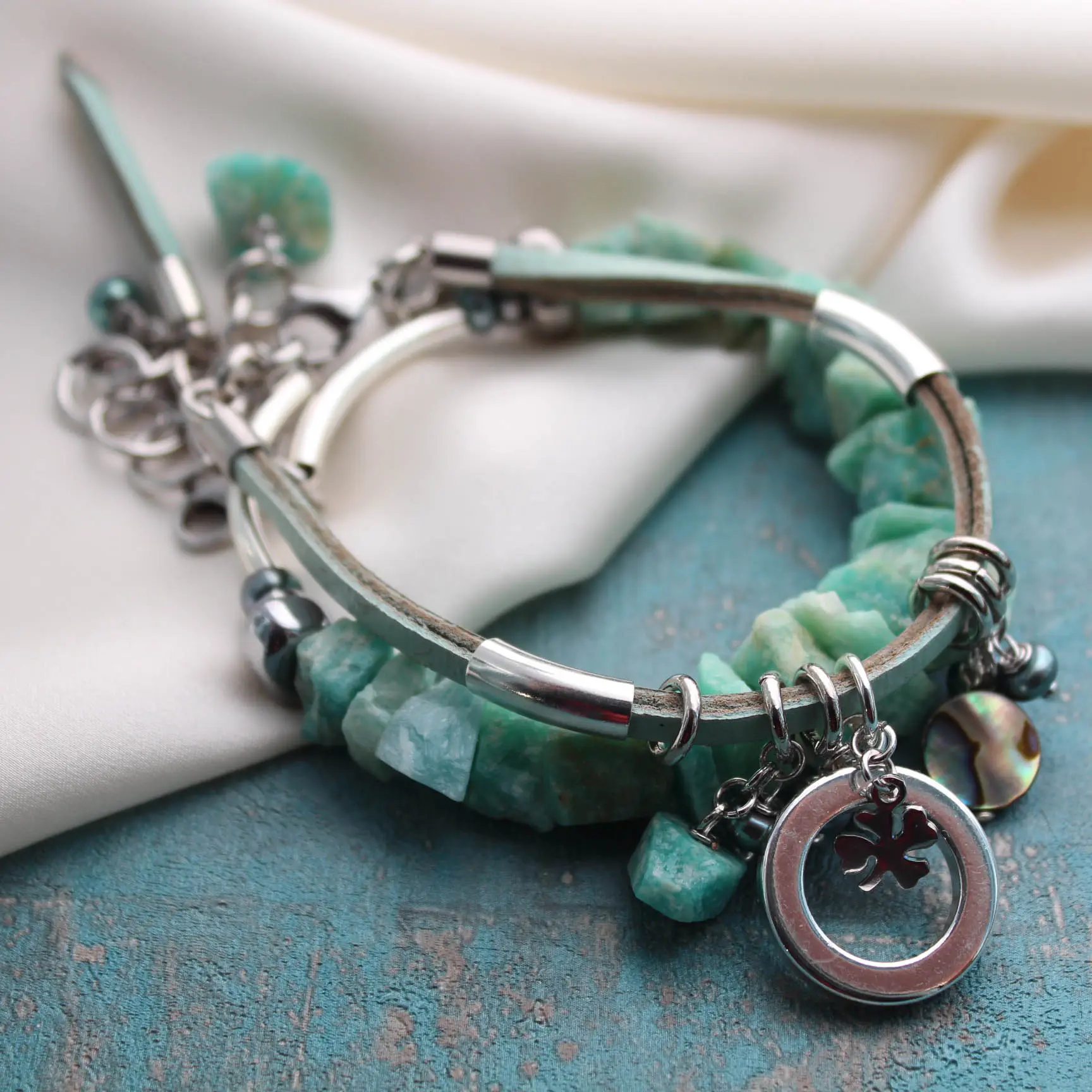 Браслеты из натурального необработанного амазонита, каучука, натурального жемчуга, гелиотиса, натуральной кожи, посеребренных подвесок.