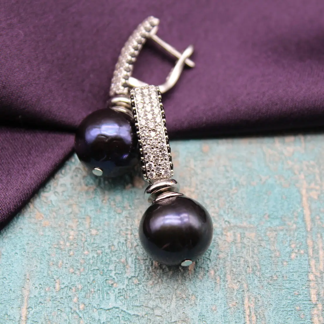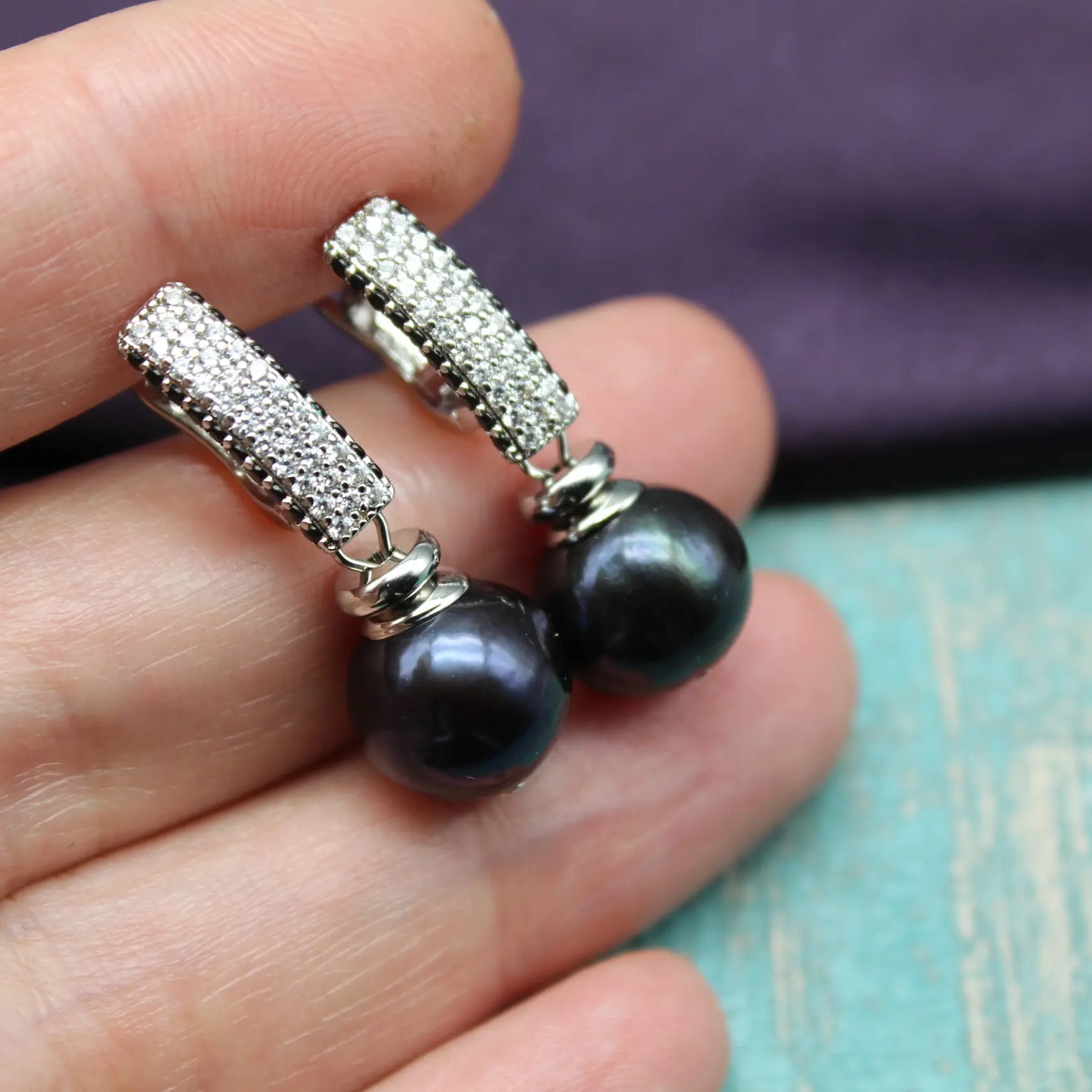 Изящные серьги из черного натурального жемчуга, серебра 925, черно-белых цирконов.